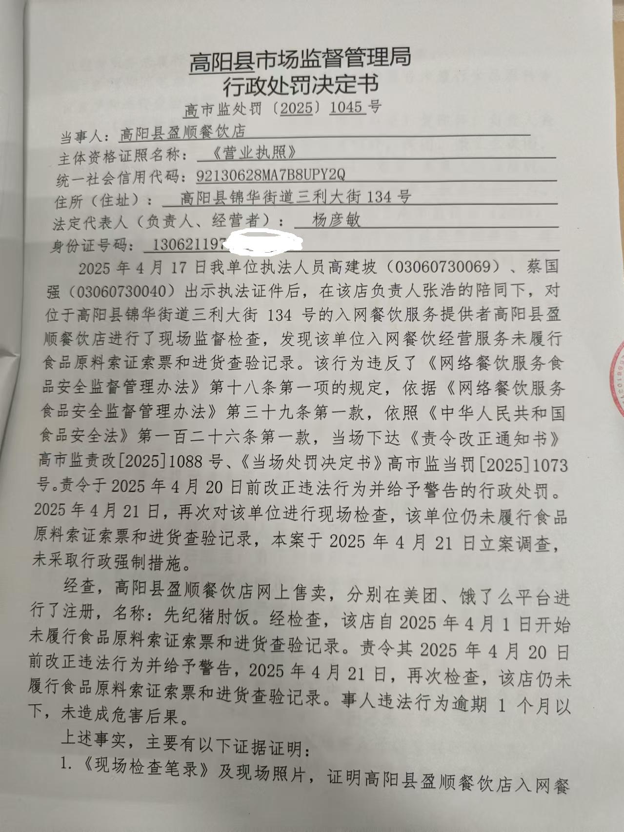 高阳县盈顺餐饮店入网餐饮经营服务未履行索证索票和进货查验记录案