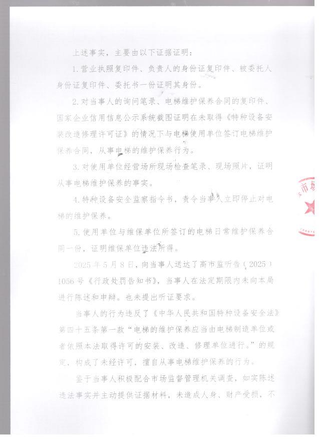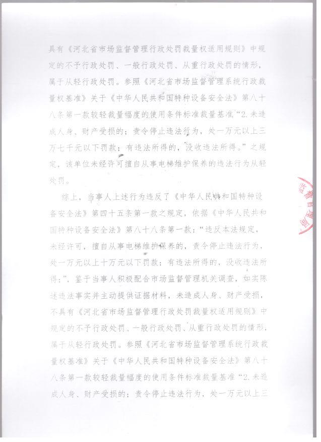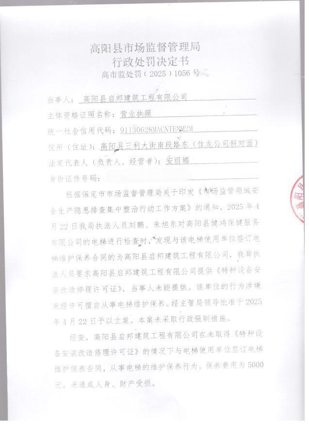 高阳县启邦建筑工程有限公司未经许可擅自从事电梯维护保养案