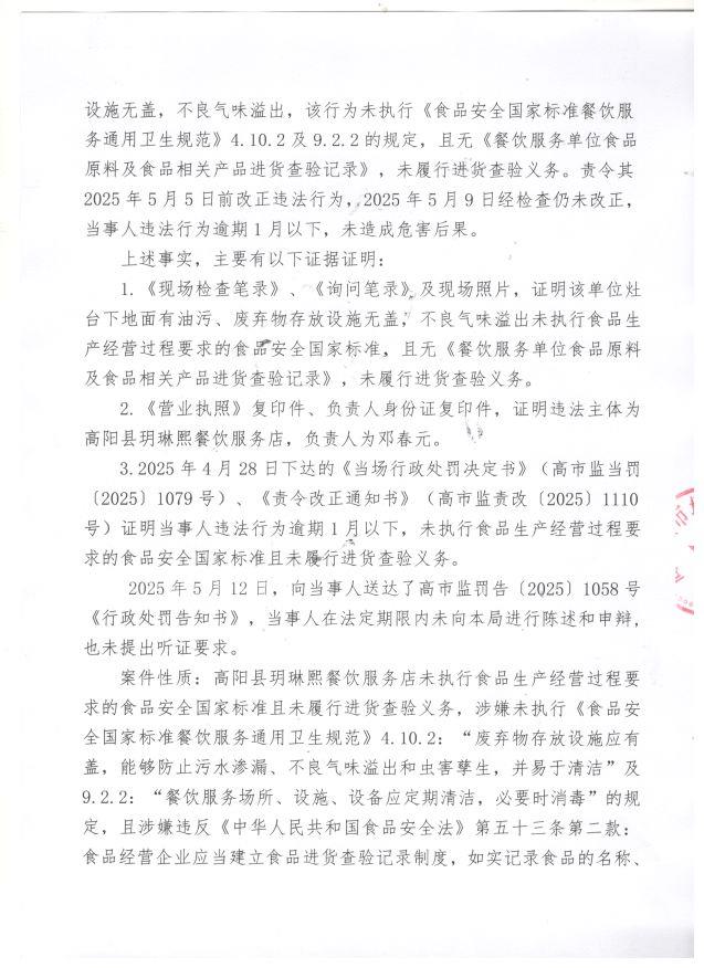 高阳县玥琳熙餐饮服务店未执行食品生产经营过程要求的食品安全国家标准且未履行进货查验义务案