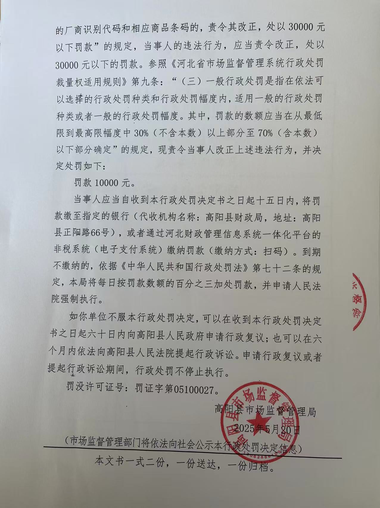 高阳县利川巾被厂生产的毛巾冒用商品条码案