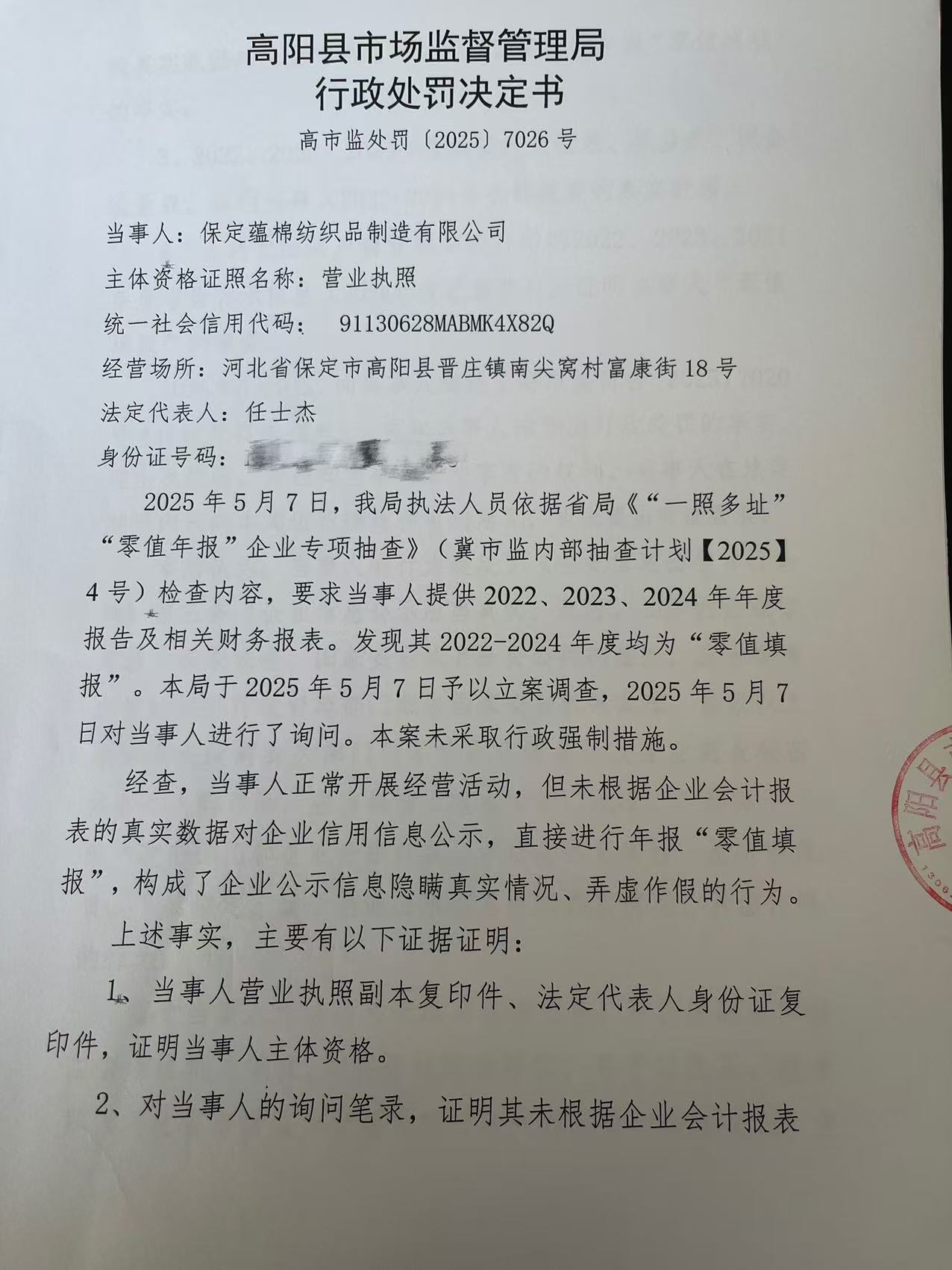 保定蕴棉纺织品制造有限公司企业公示信息隐瞒真实情况、弄虚作假案