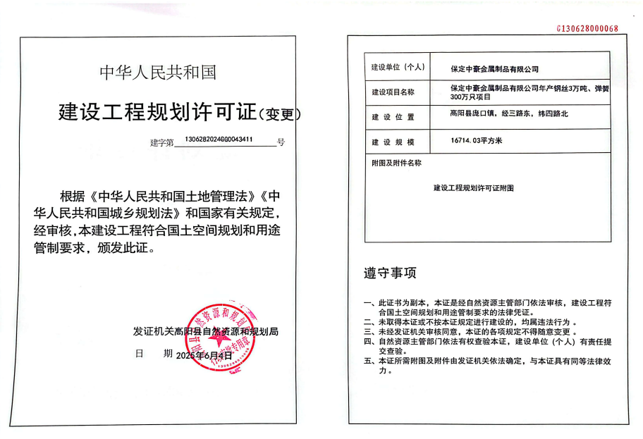 保定中豪金属制品有限公司年产钢丝3万吨、弹簧300万只项目(变更)