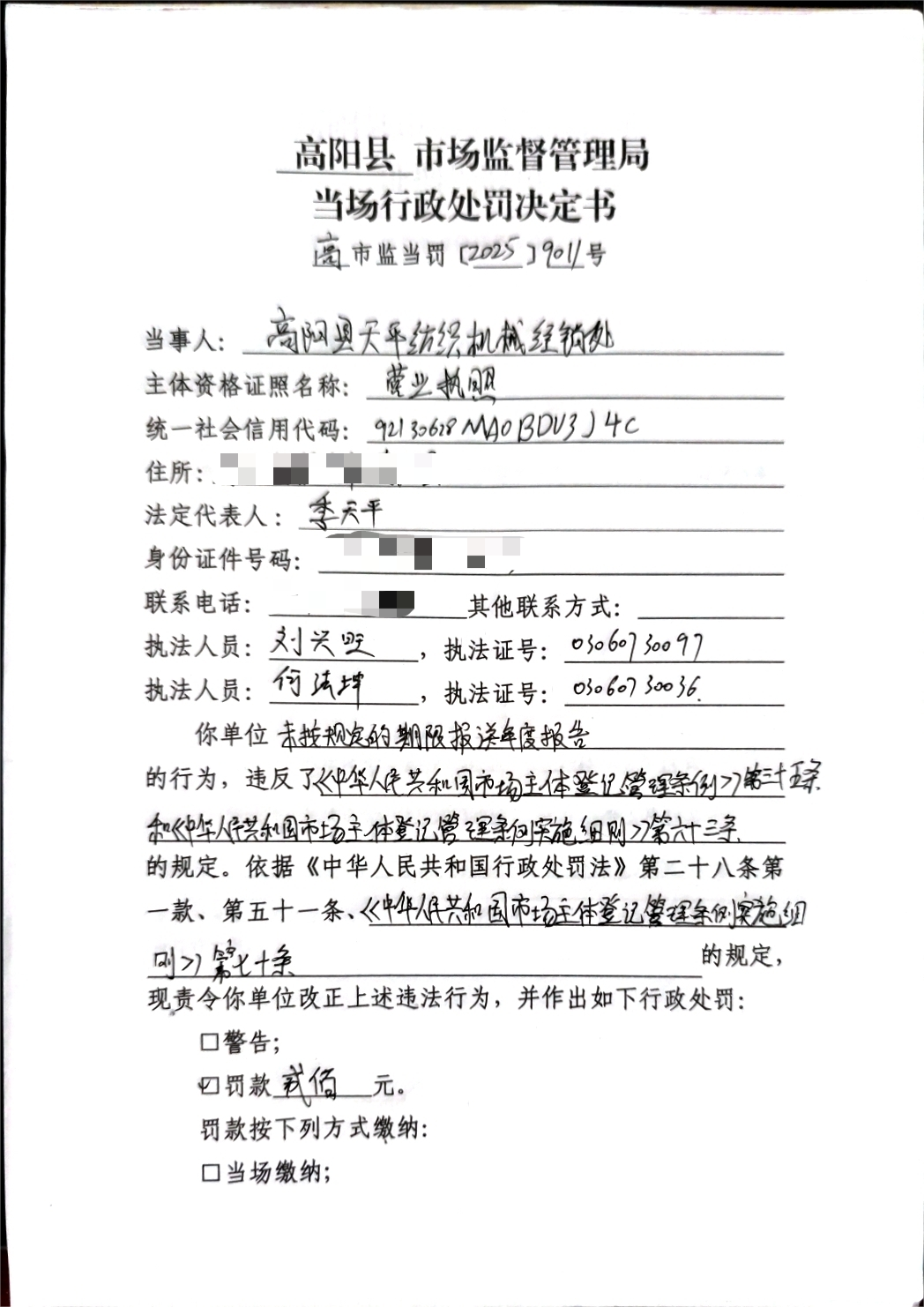高阳县捷达运输服务部未按规定期限报送年度报告案