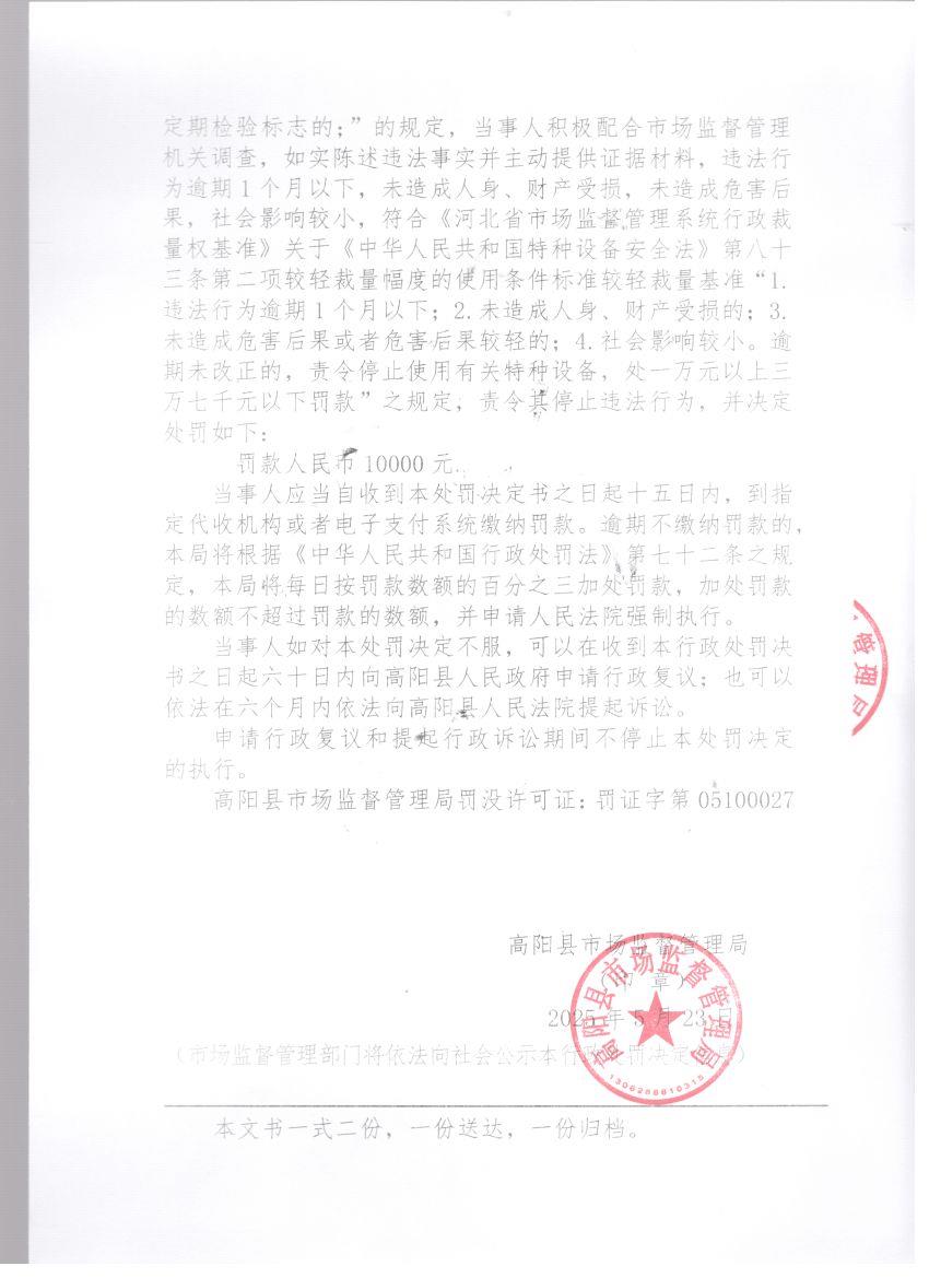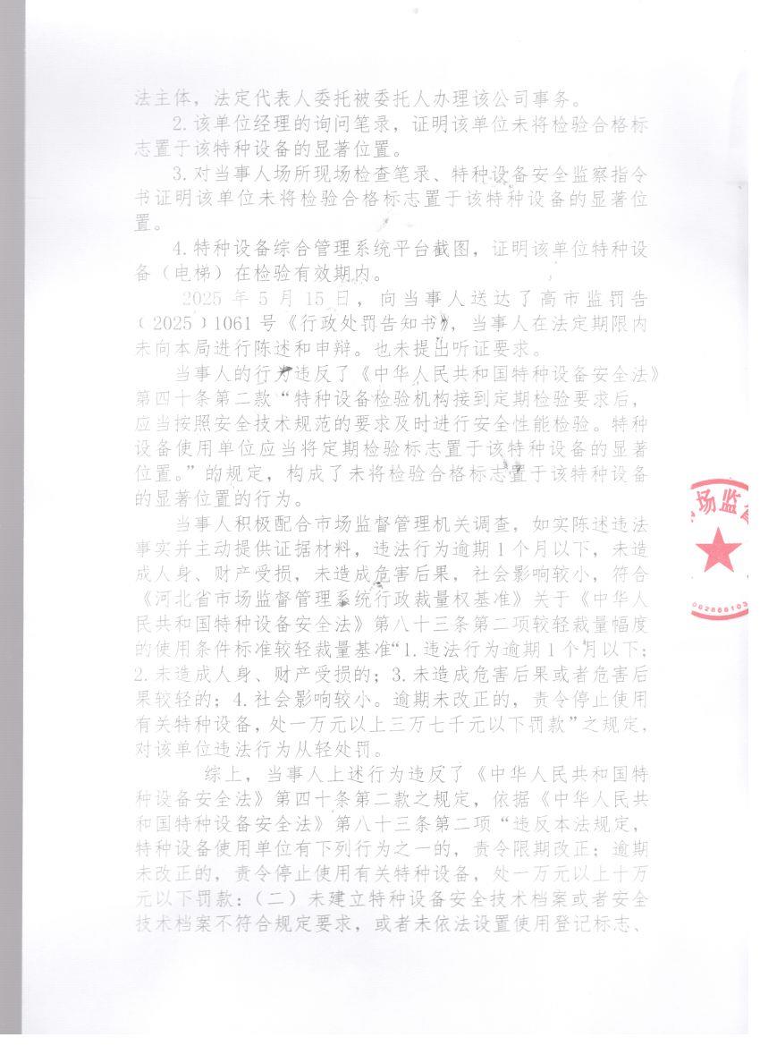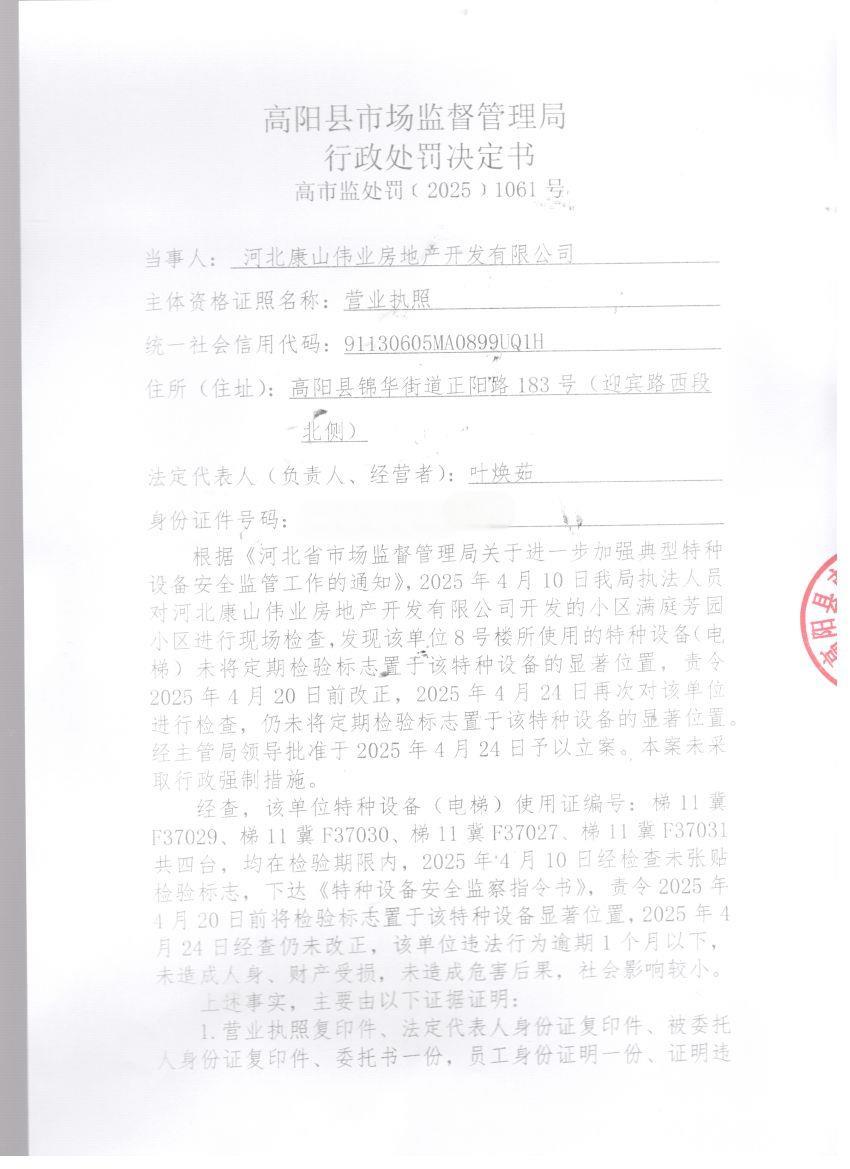 河北康山伟业房地产开发有限公司未将定期检验标志置于该特种设备的显著位置案