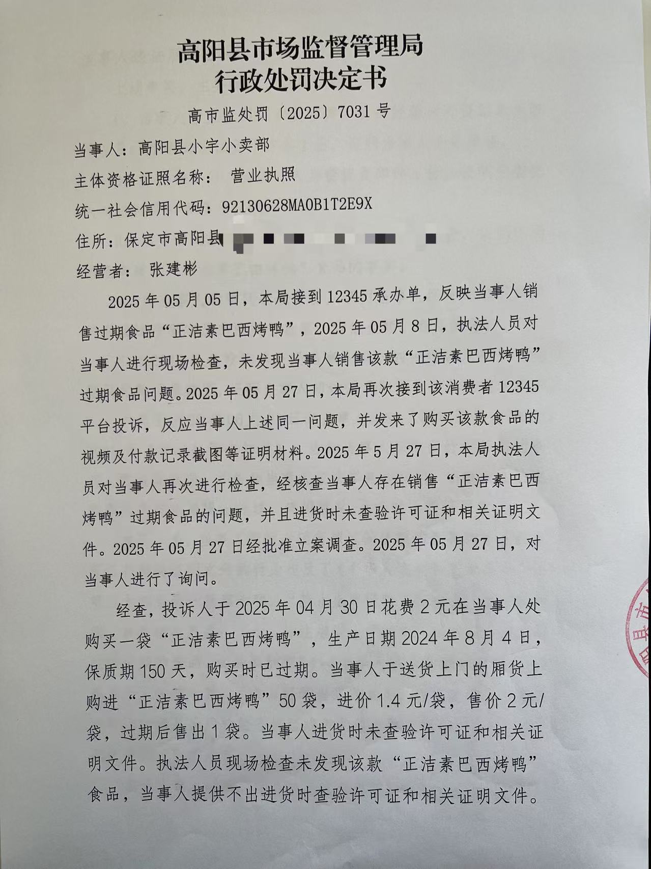 高阳县小宇小卖部经营超过保质期的食品和未查验许可证和相关证明文件案