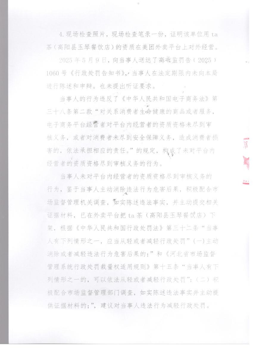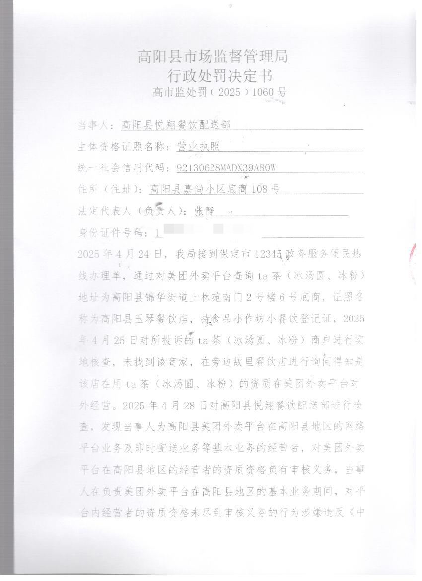 高阳县悦翔餐饮配送部对平台内经营者的资质资格未尽到审查义务案
