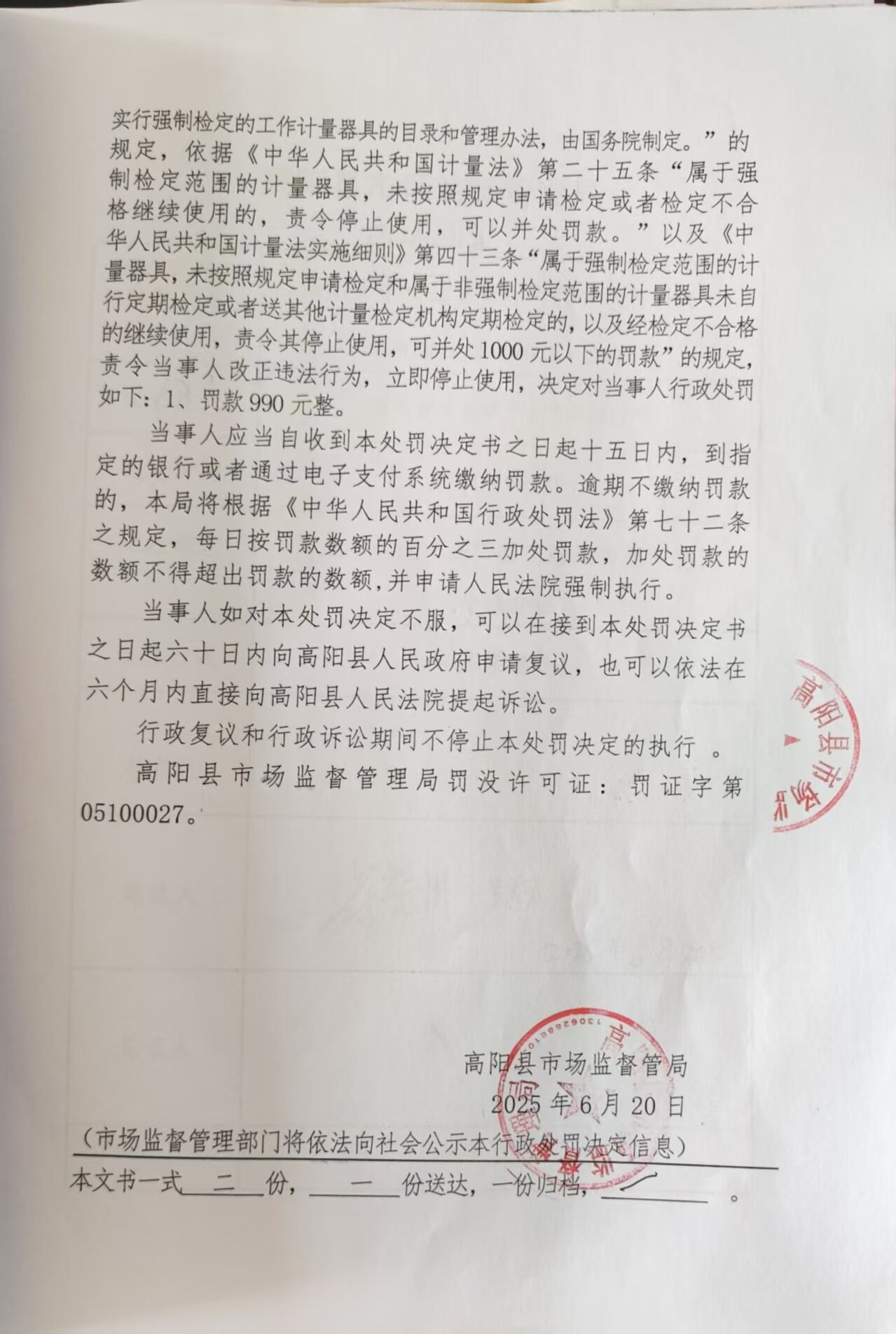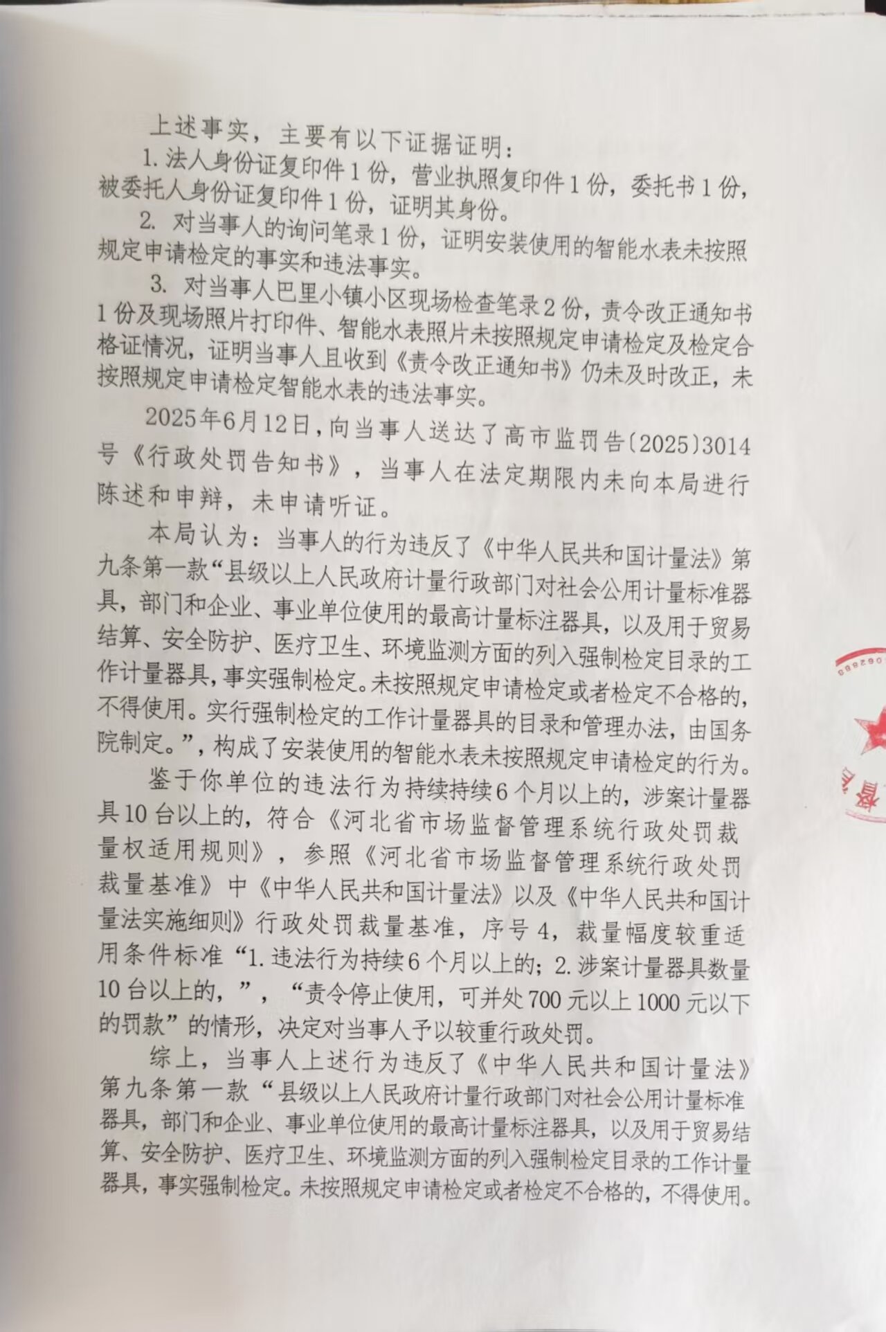 保定普州房地产开发有限公司安装使用的智能水表未按照规定申请检定案
