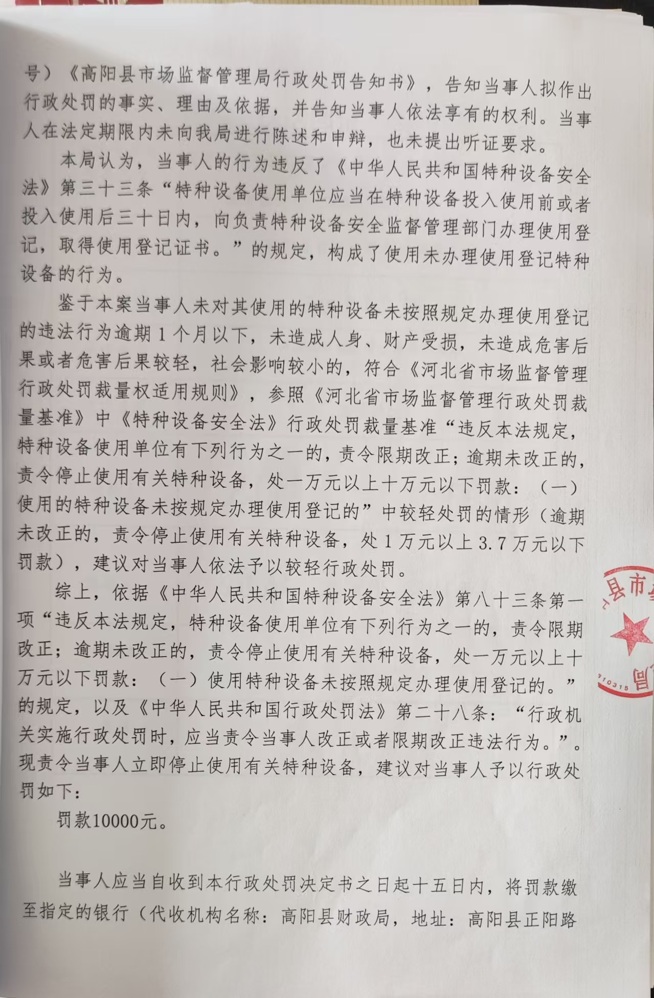 高阳县智拓纱网制造有限公司使用未办理使用登记证叉车案