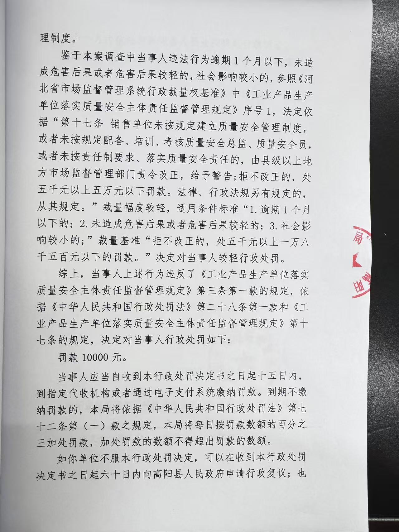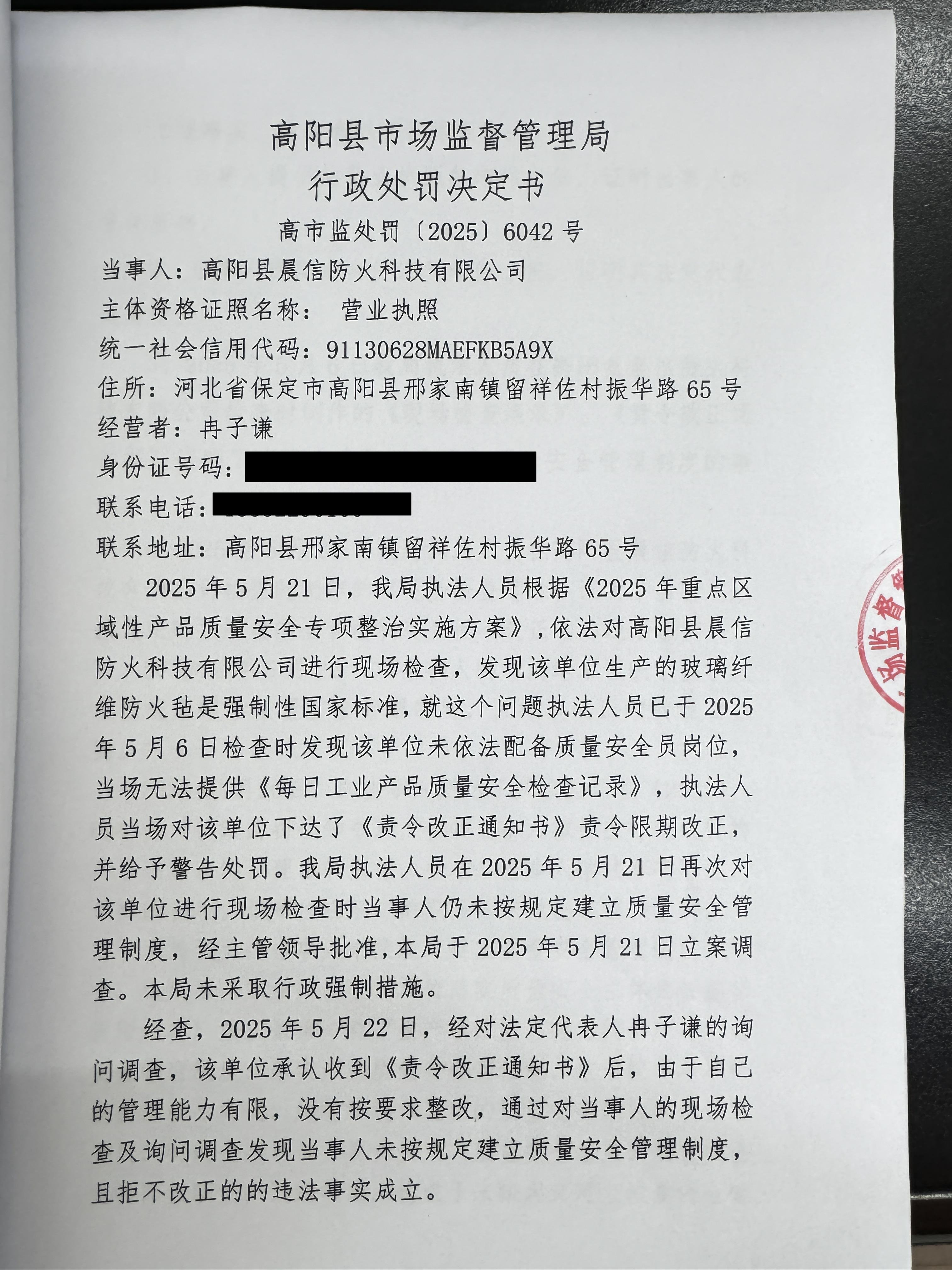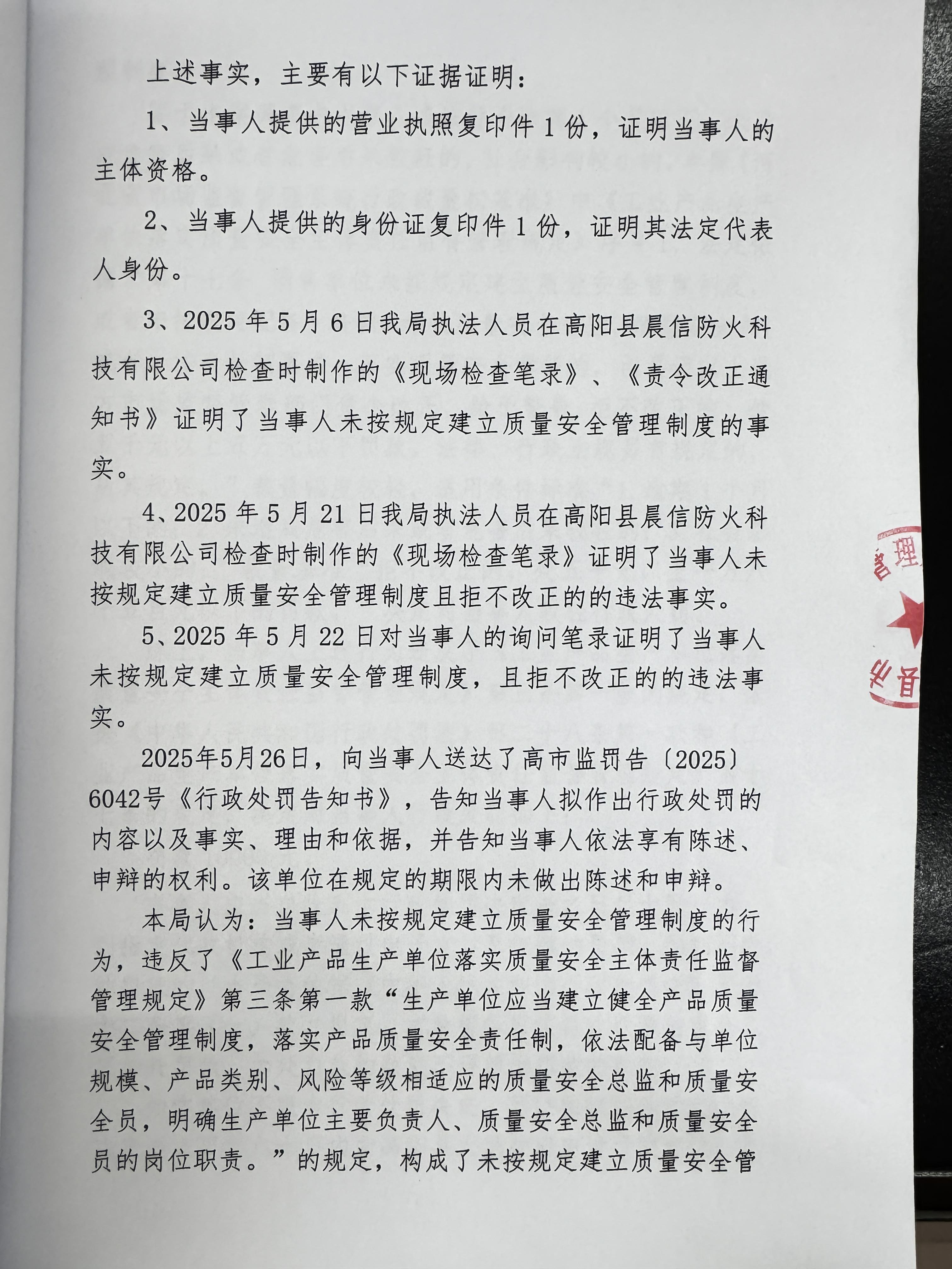 高阳县晨信防火科技有限公司未按规定建立质量安全管理制度
