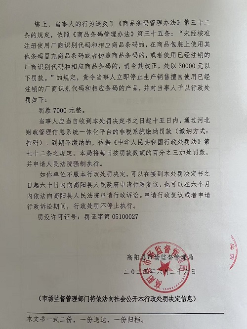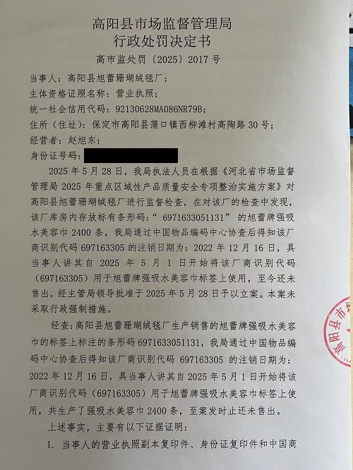 高阳县旭蕾珊瑚绒毯厂擅自使用已经注销的 厂商识别代码和相应商品条码案