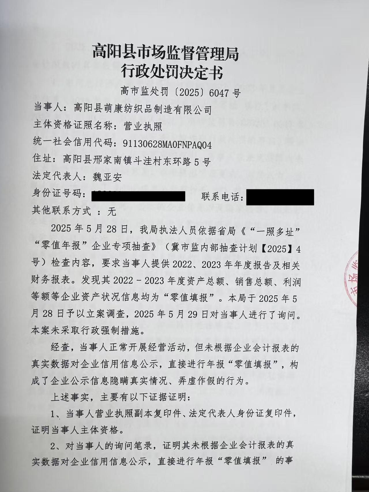 高阳县萌康纺织品制造有限公司企业公示信息隐瞒真实情况、弄虚作假案