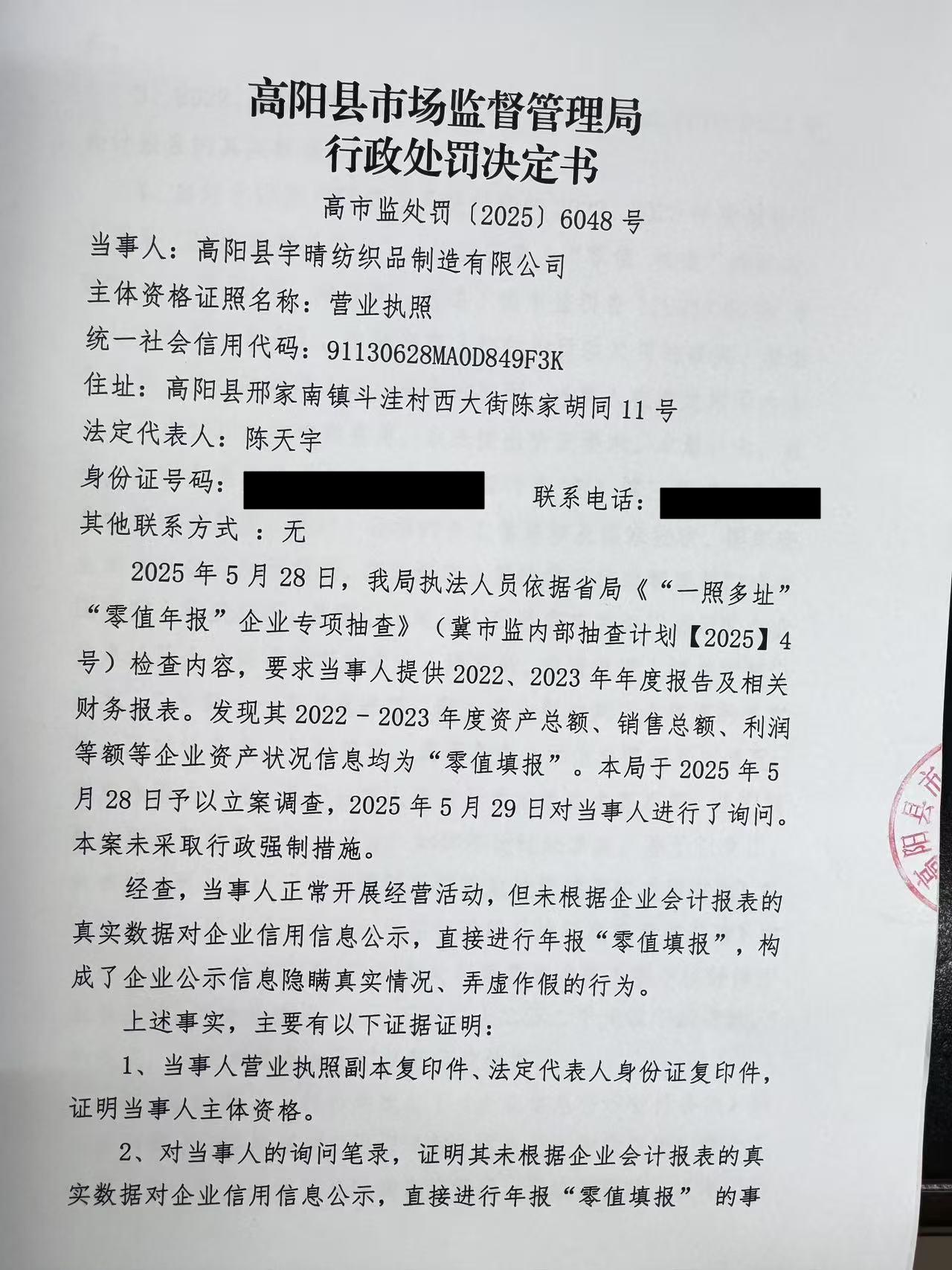 高阳县宇晴纺织品制造有限公司企业公示信息隐瞒真实情况、弄虚作假案