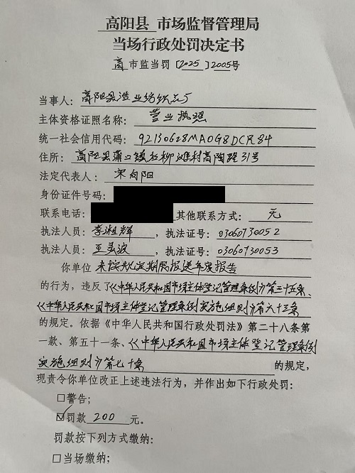 高阳县浩业纺织品厂未按规定期限报送年度报告案