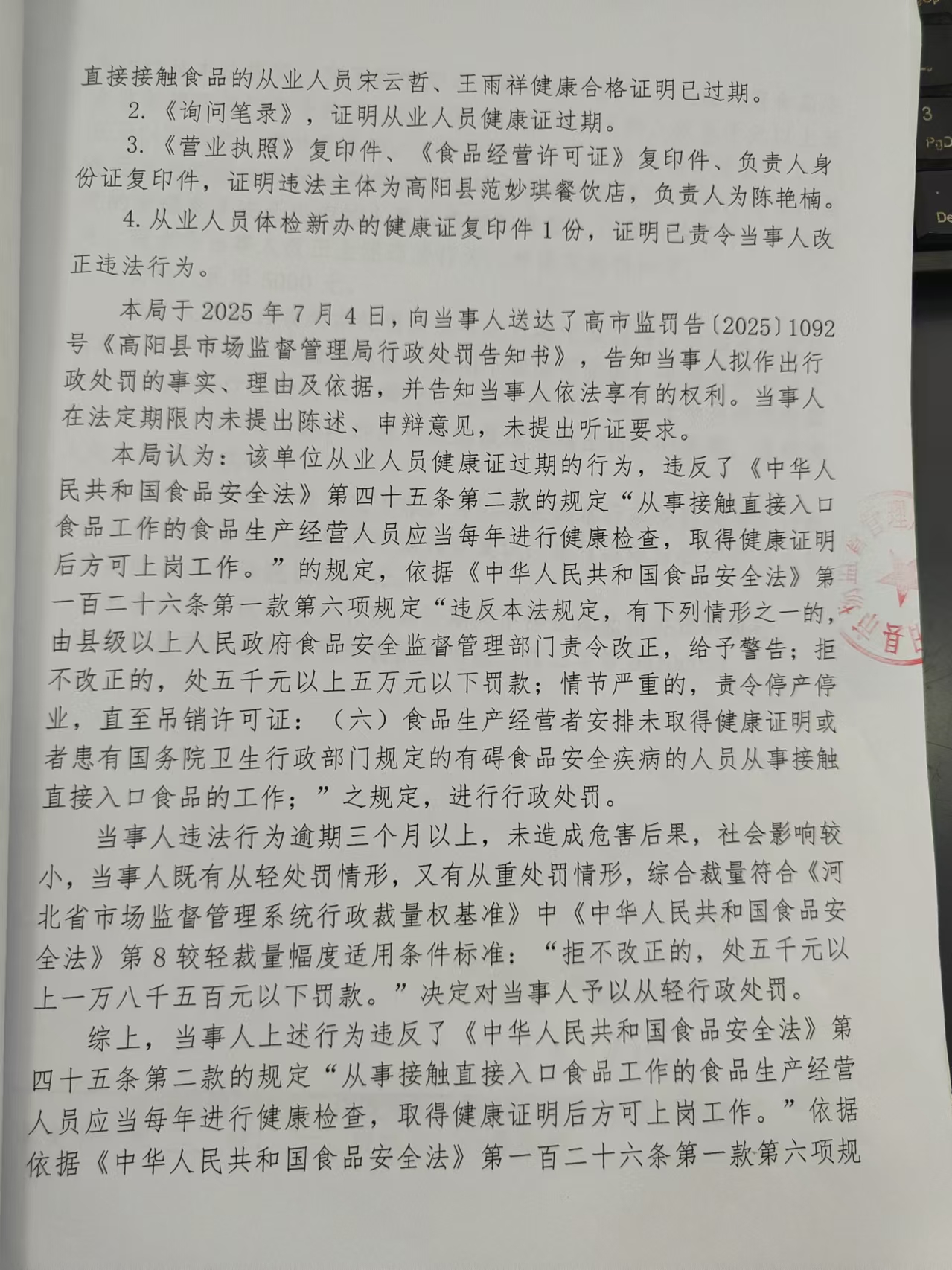 高阳县范妙琪餐饮店从业人员健康证过期案