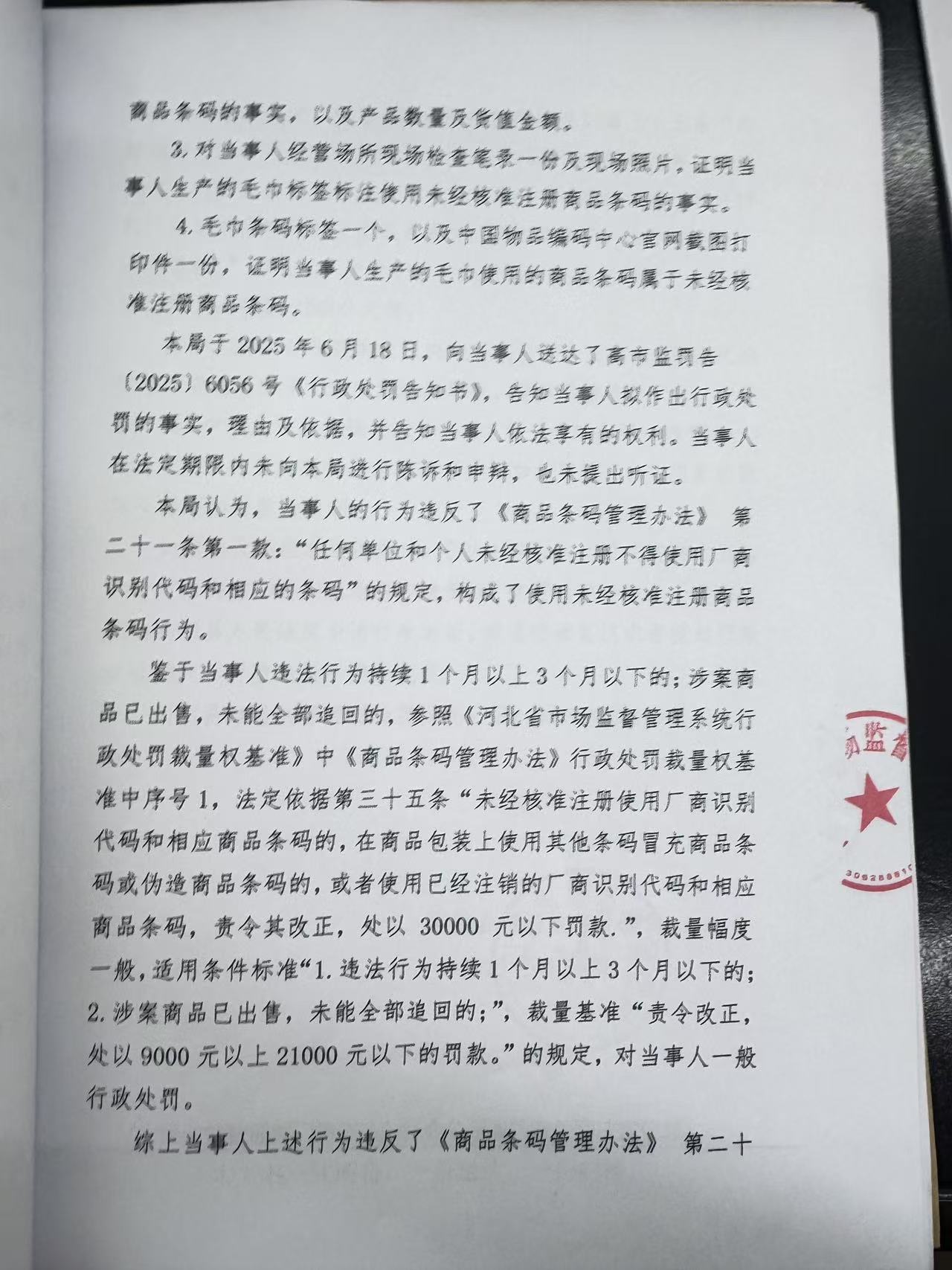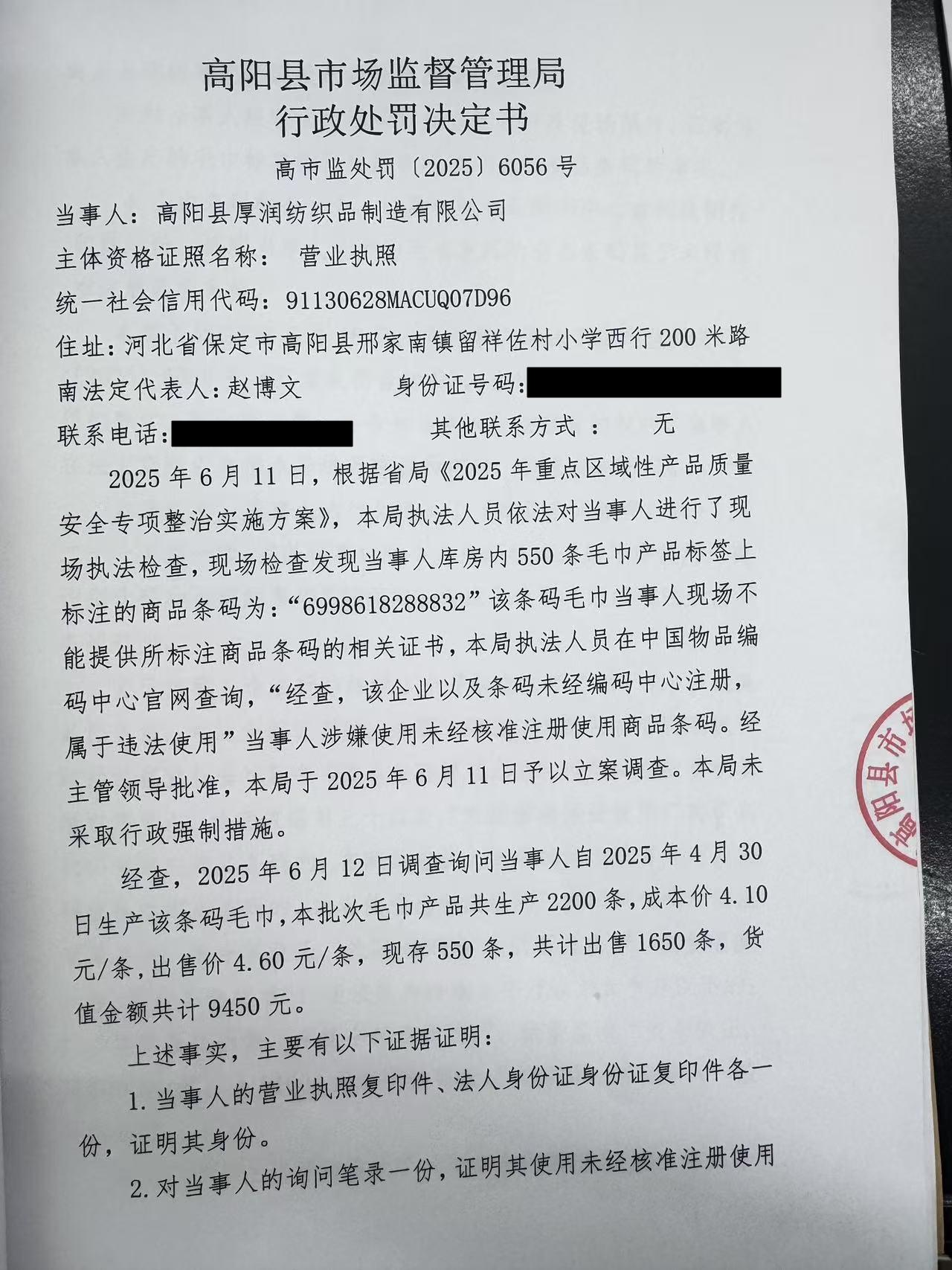 高阳县厚润纺织品制造有限公司生产的毛巾未经核准注册使用商品条码