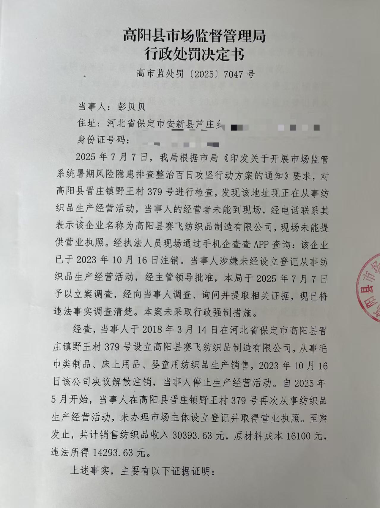 彭贝贝未经设立登记从事纺织品生产经营活动案