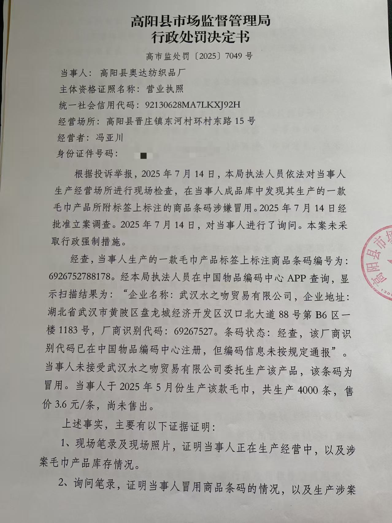 高阳县奥达纺织品厂生产的毛巾冒用商品条码案