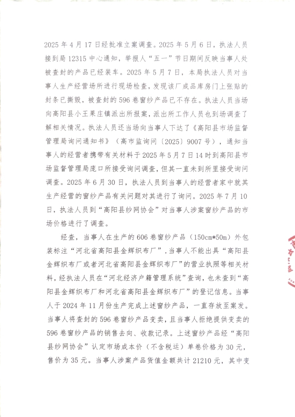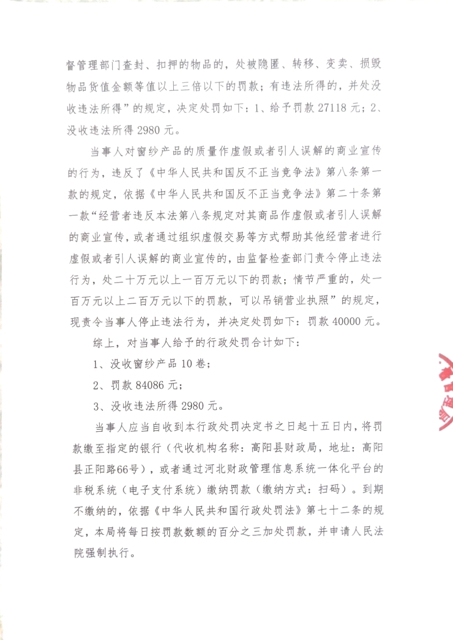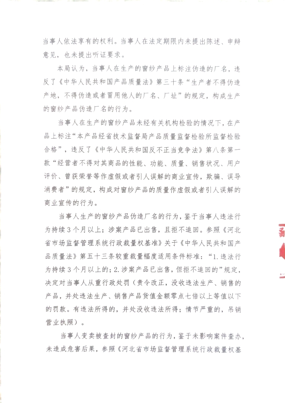 高阳县小峰织物厂(个体工商户) 生产的窗纱产品伪造厂名和对窗纱产品的质量 作虚假或者引人误解的商业宣传案