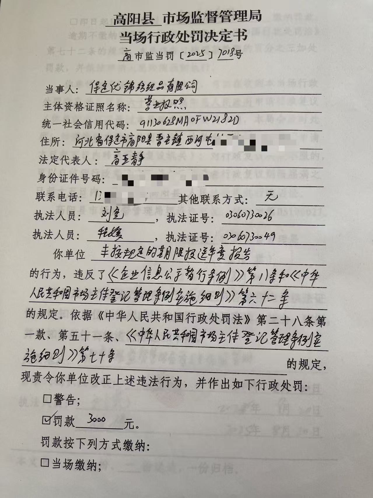 保定优锦纺织品有限公司未按规定的期限报送年度报告案