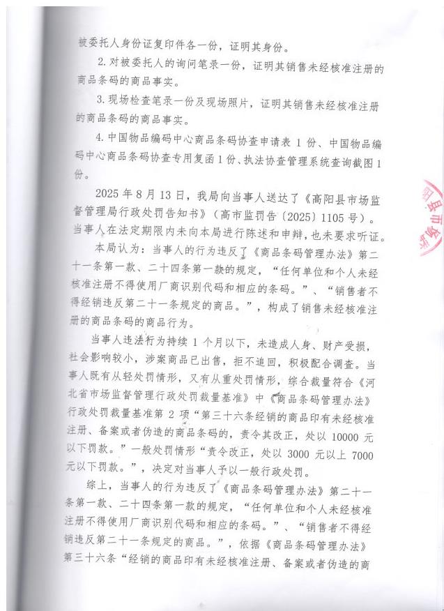 高阳县爱购日用百货店销售未经核准注册的商品条码的商品案