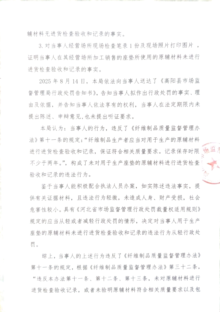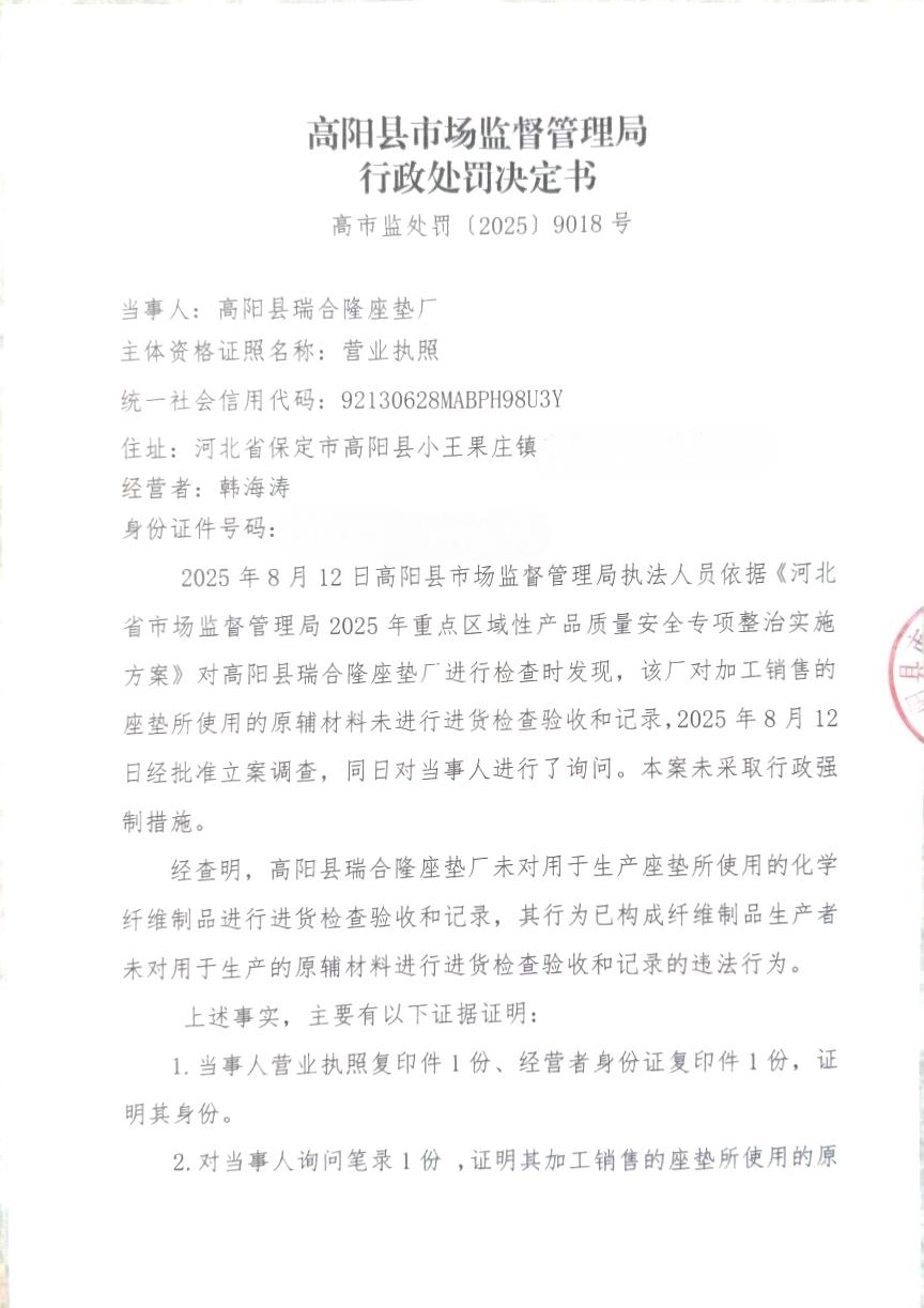 高阳县瑞合隆座垫厂未对用于生产座垫的原辅材料进行进货检查验收和记录案