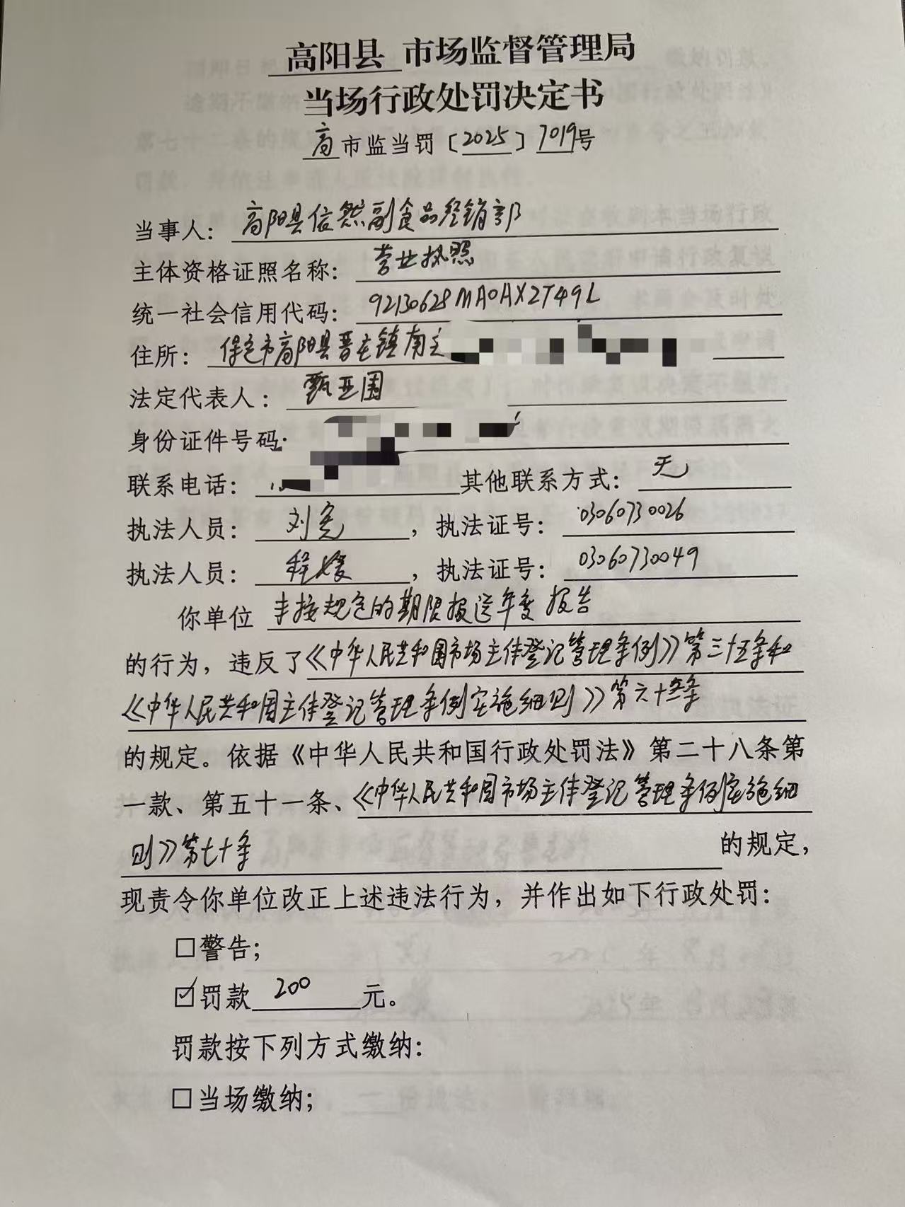 高阳县依然副食品经销部未按规定的期限报送年度报告案