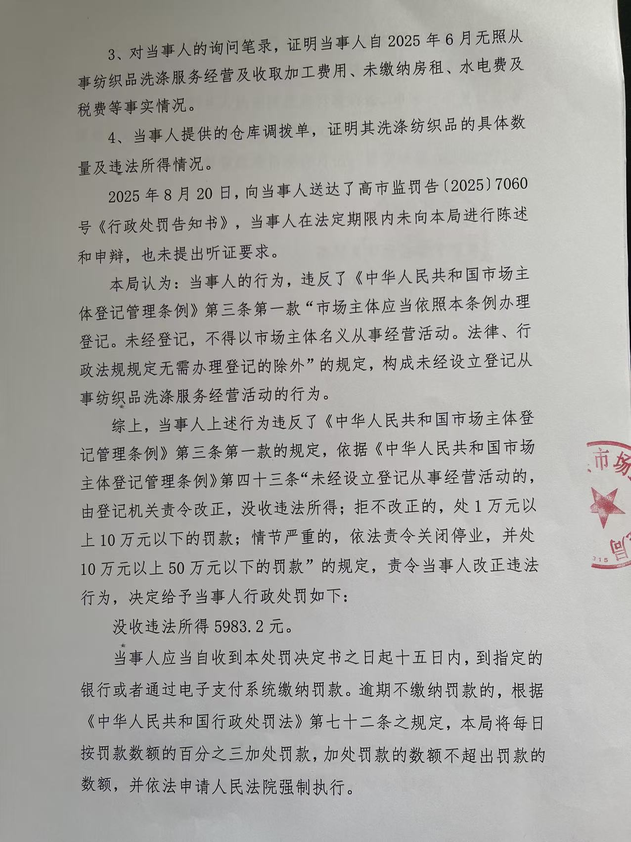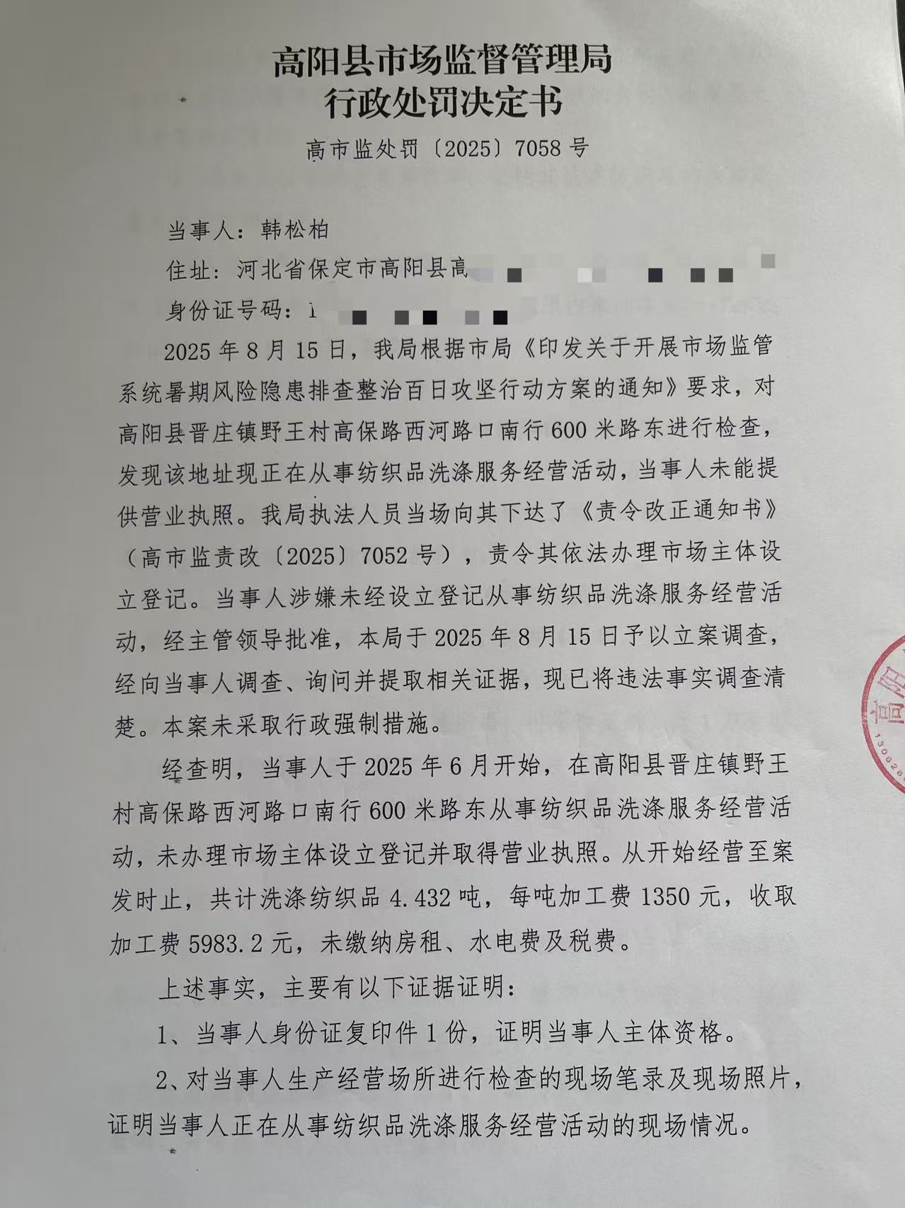 韩松柏未经设立登记从事纺织品洗涤服务经营活动案