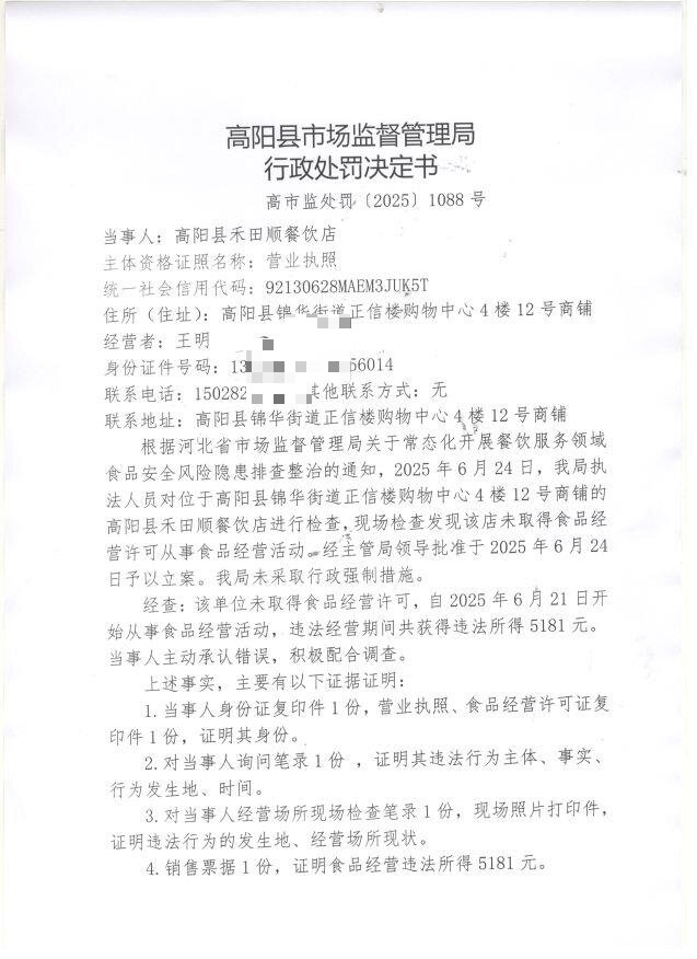 高阳县禾田顺餐饮店未取得食品经营许可从事食品经营活动案