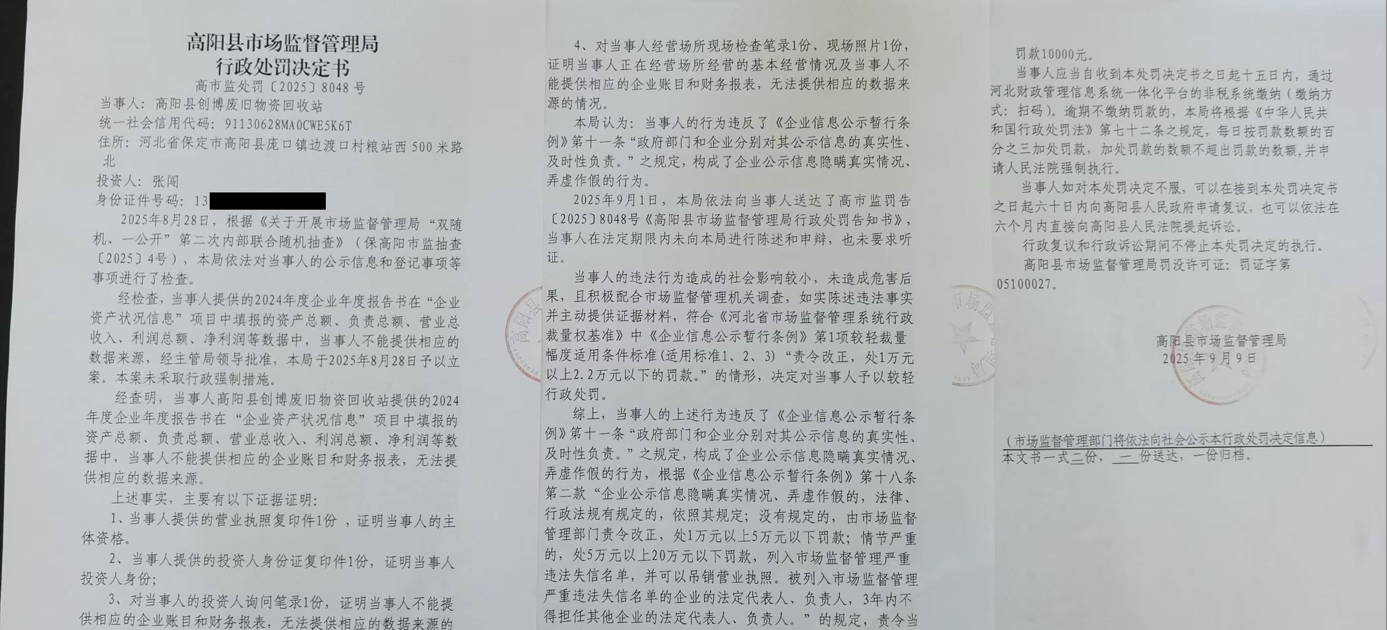 高阳县创博废旧物资回收站企业公示信息隐瞒真实情况、弄虚作假案