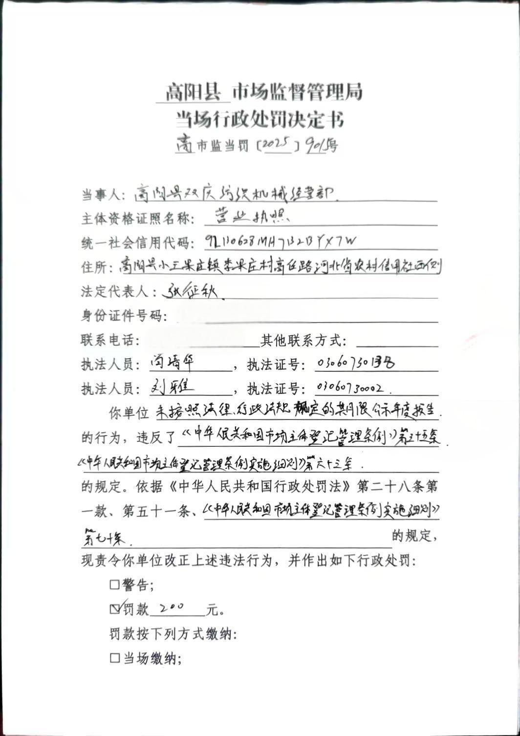 高阳县双庆纺织机械经营部未按规定期限报送年度报告案