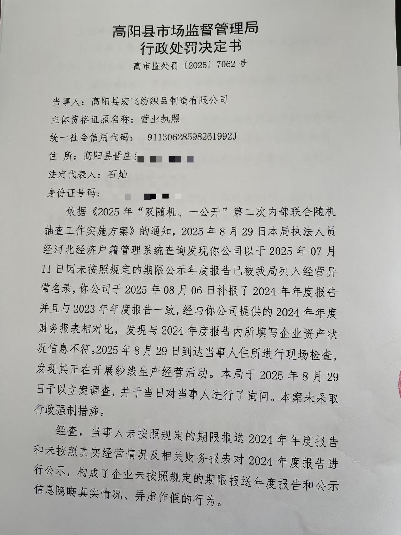 高阳县宏飞纺织品制造有限公司企业公示信息隐瞒真实情况、弄虚作假案