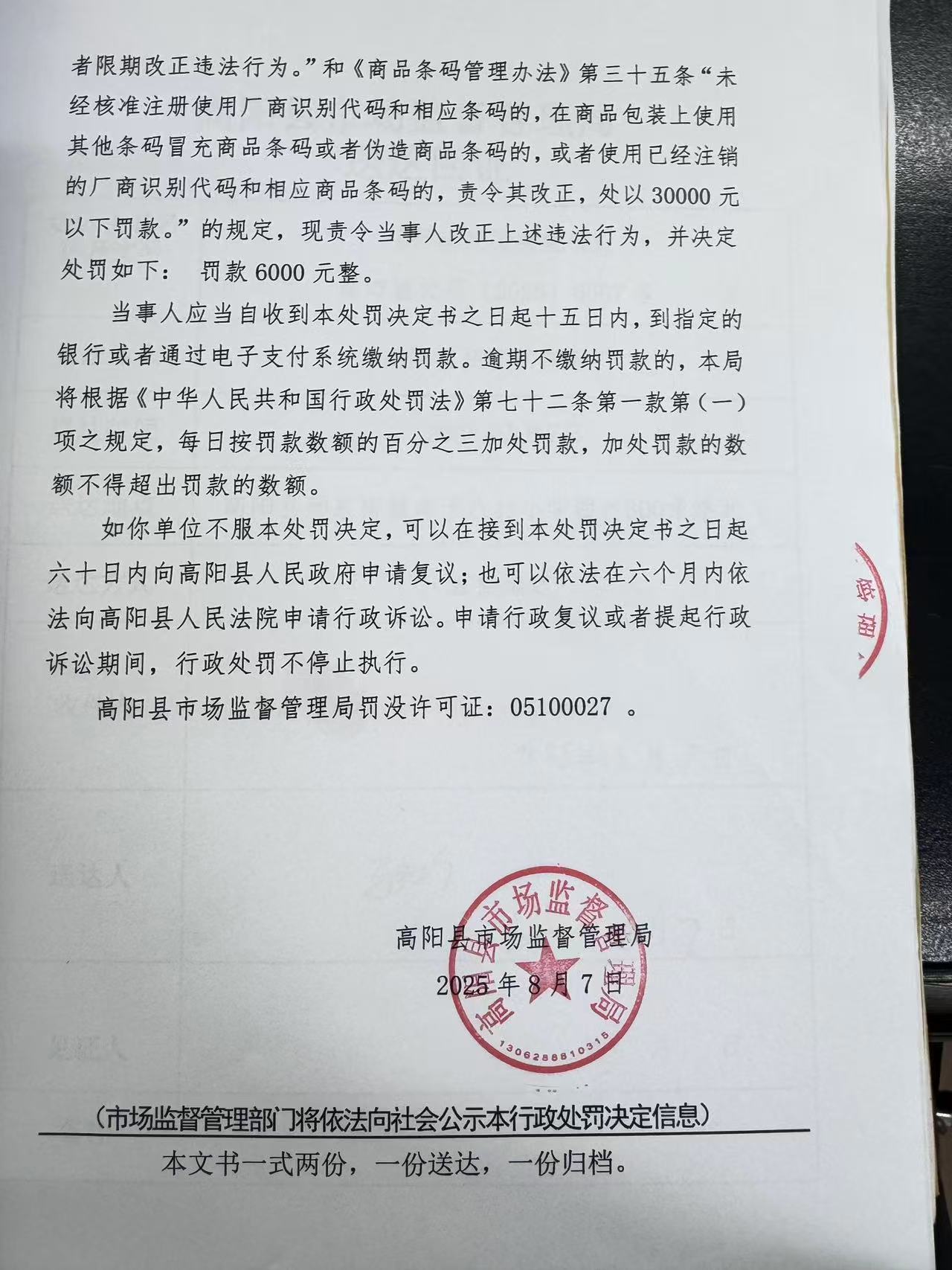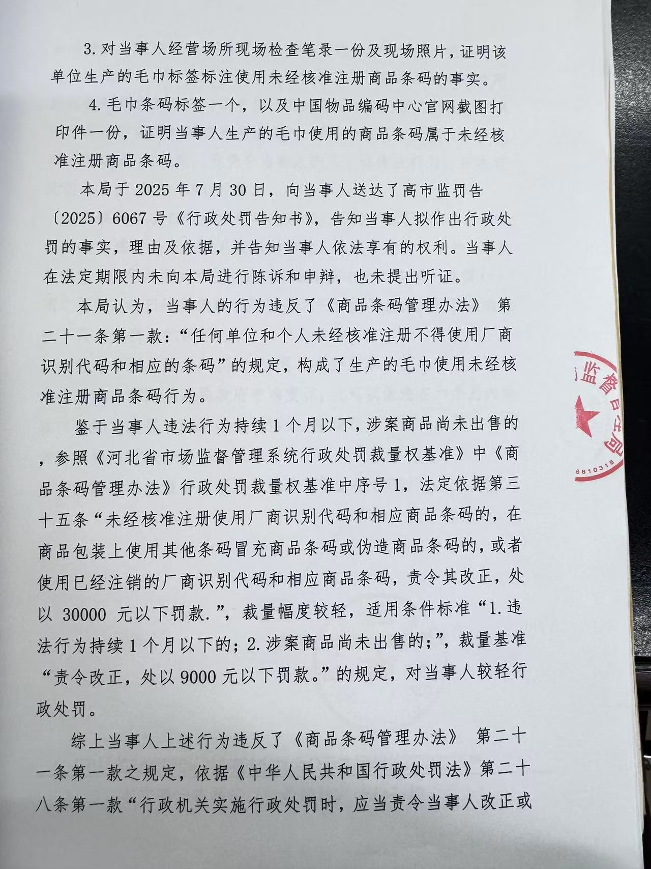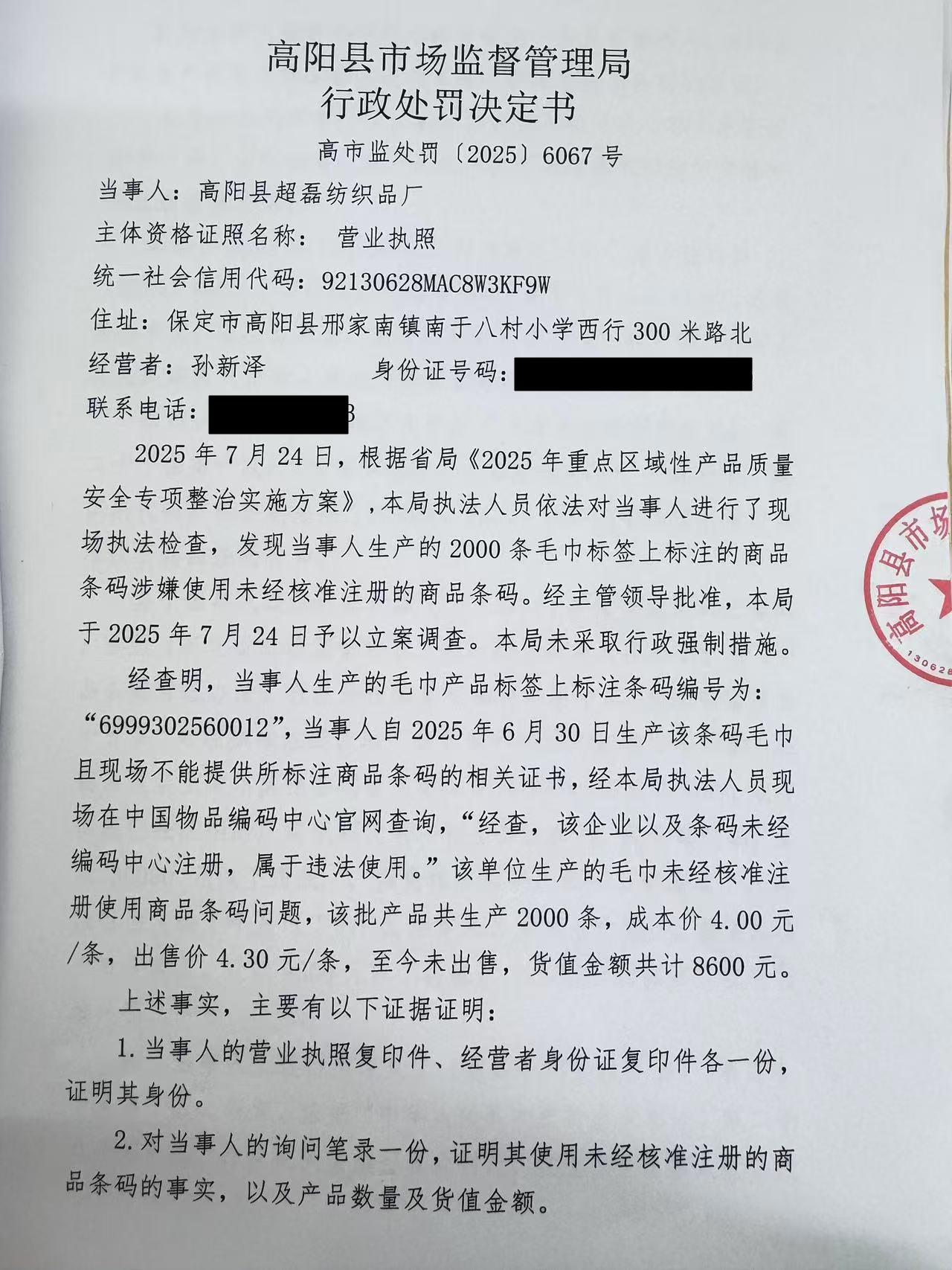 高阳县超磊纺织品厂生产的毛巾未经核准注册使用商品条码
