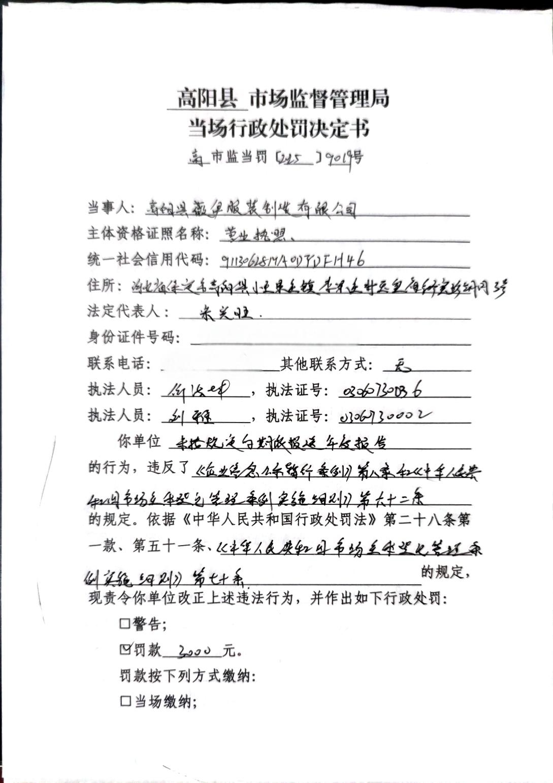 高阳县薇伊服装制造有限公司未按照规定期限保定年度报告案