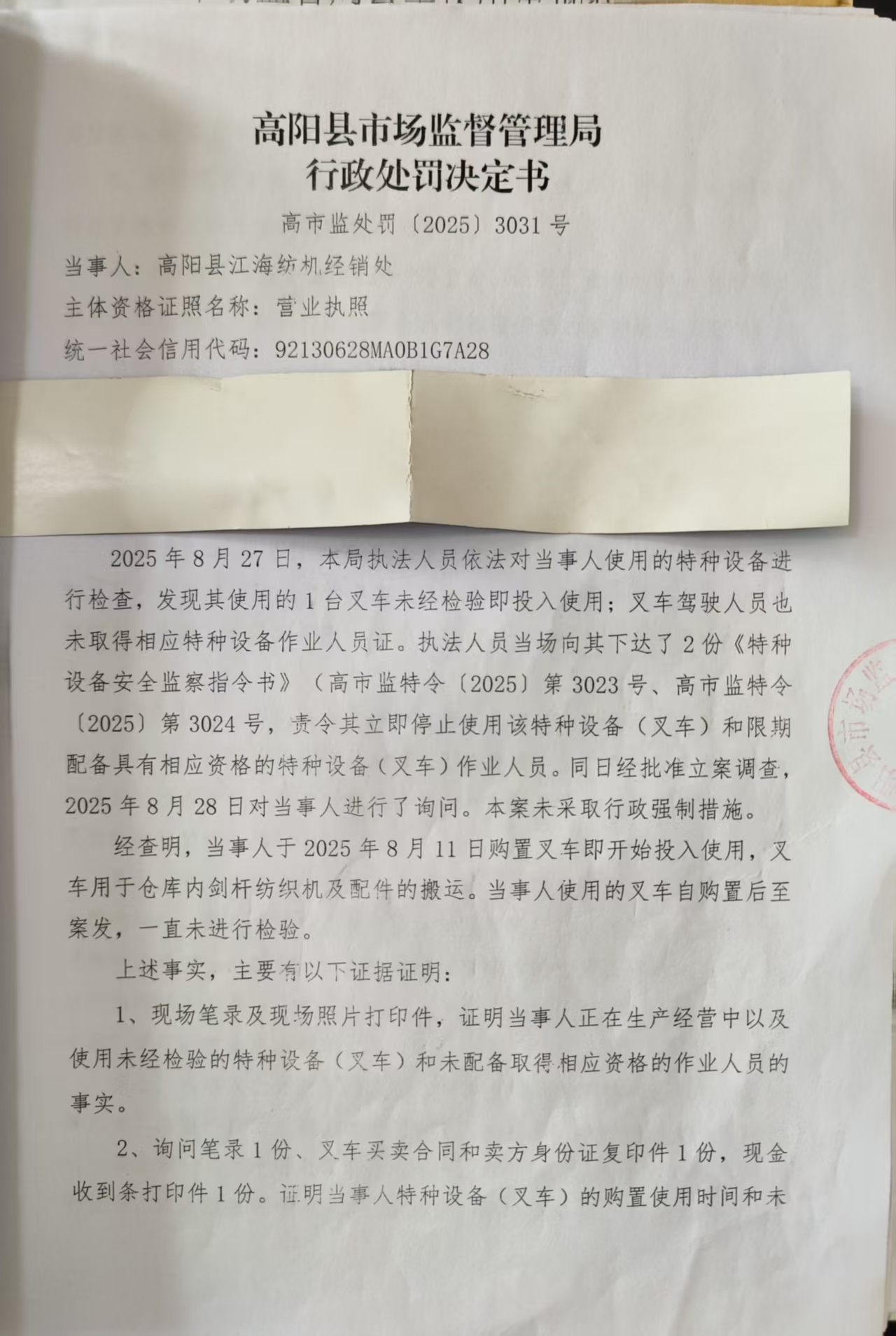 高阳县江海纺机经销处涉嫌使用未经检验的特种设备