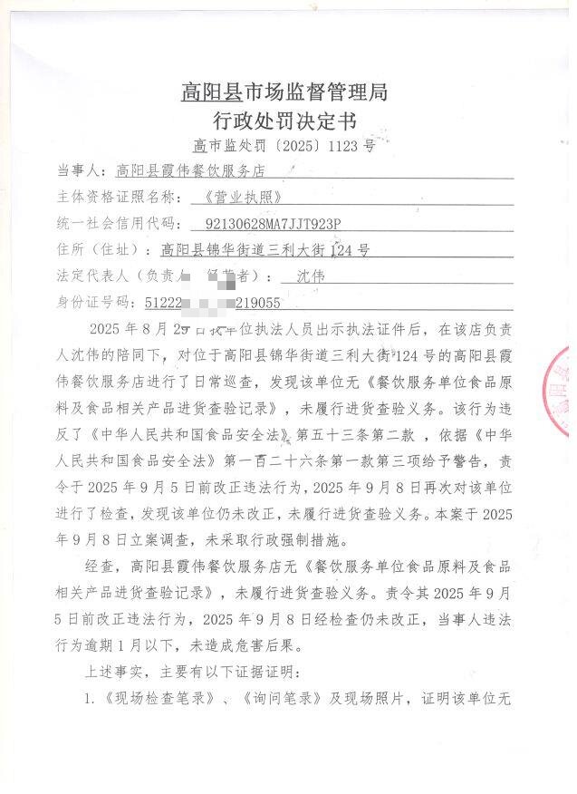 高阳县霞伟餐饮店未履行进货查验义务案