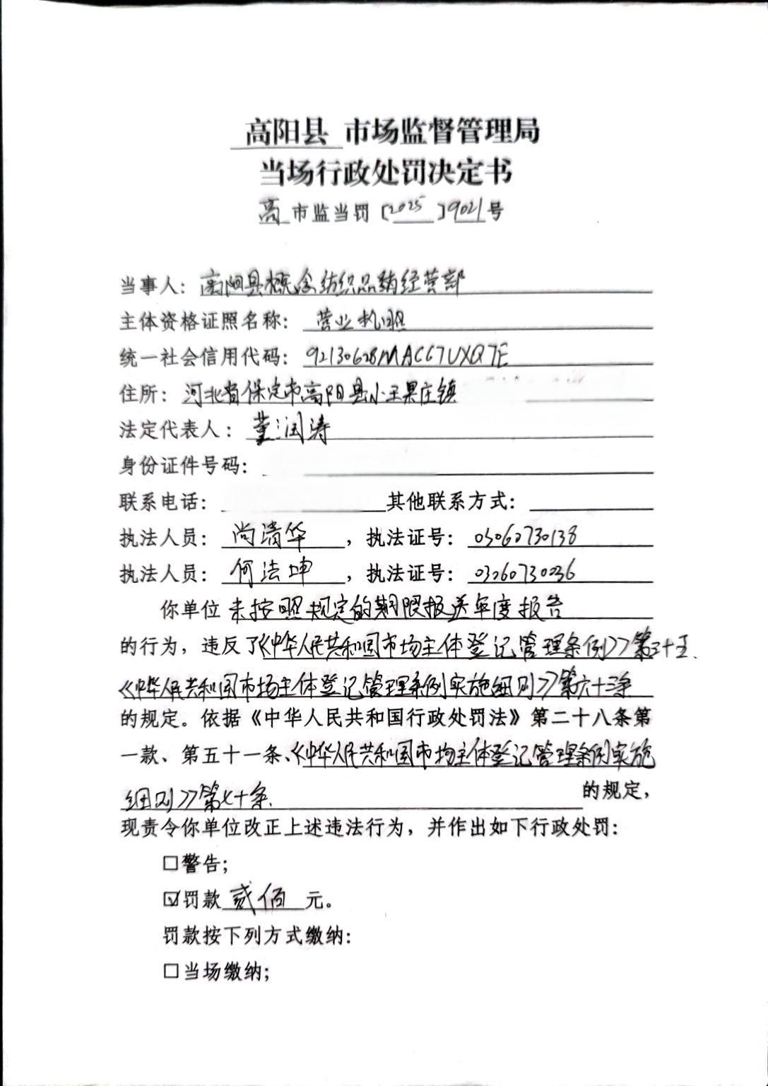 高阳县概念纺织品经营部未按规定期限报送年度报告案