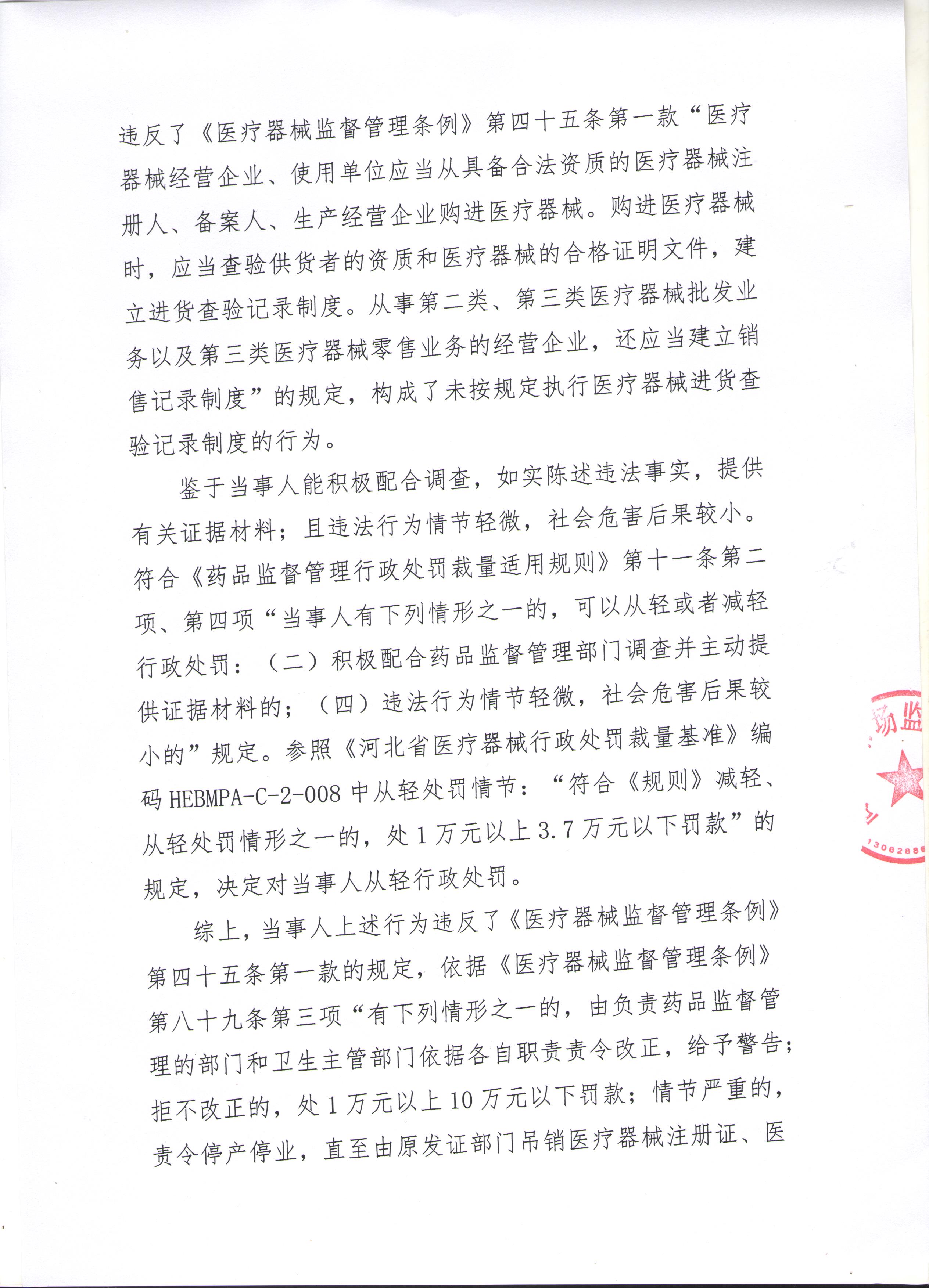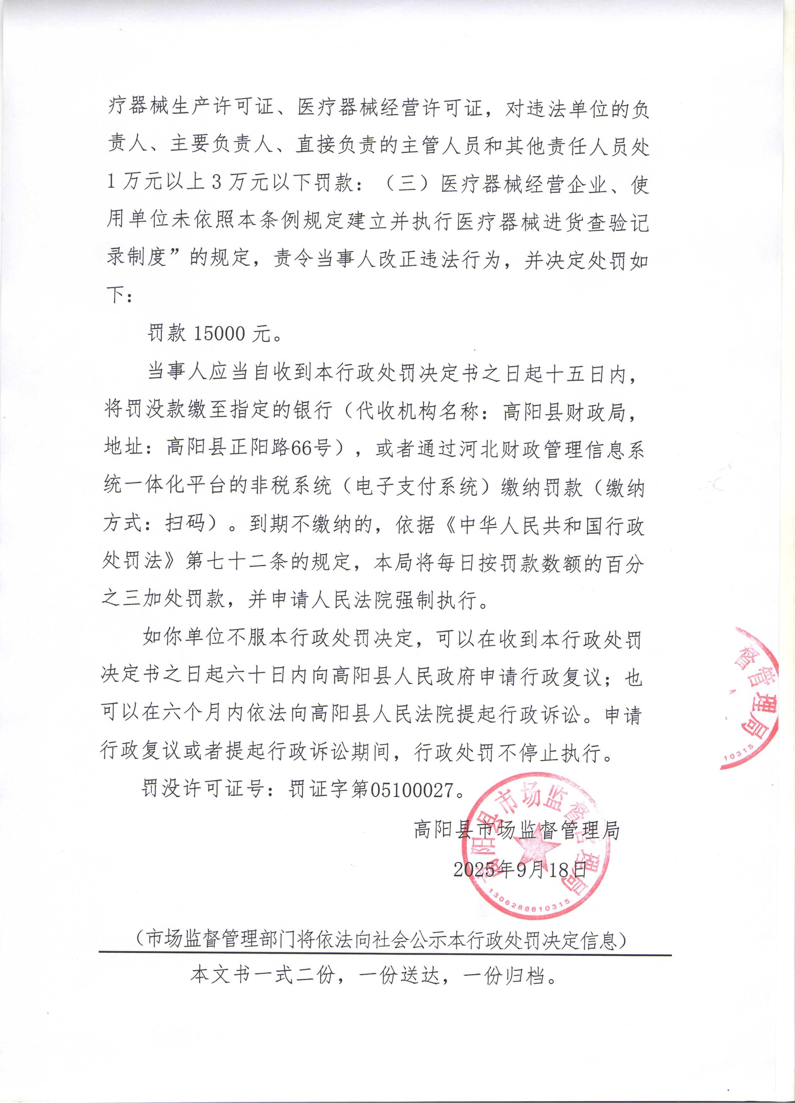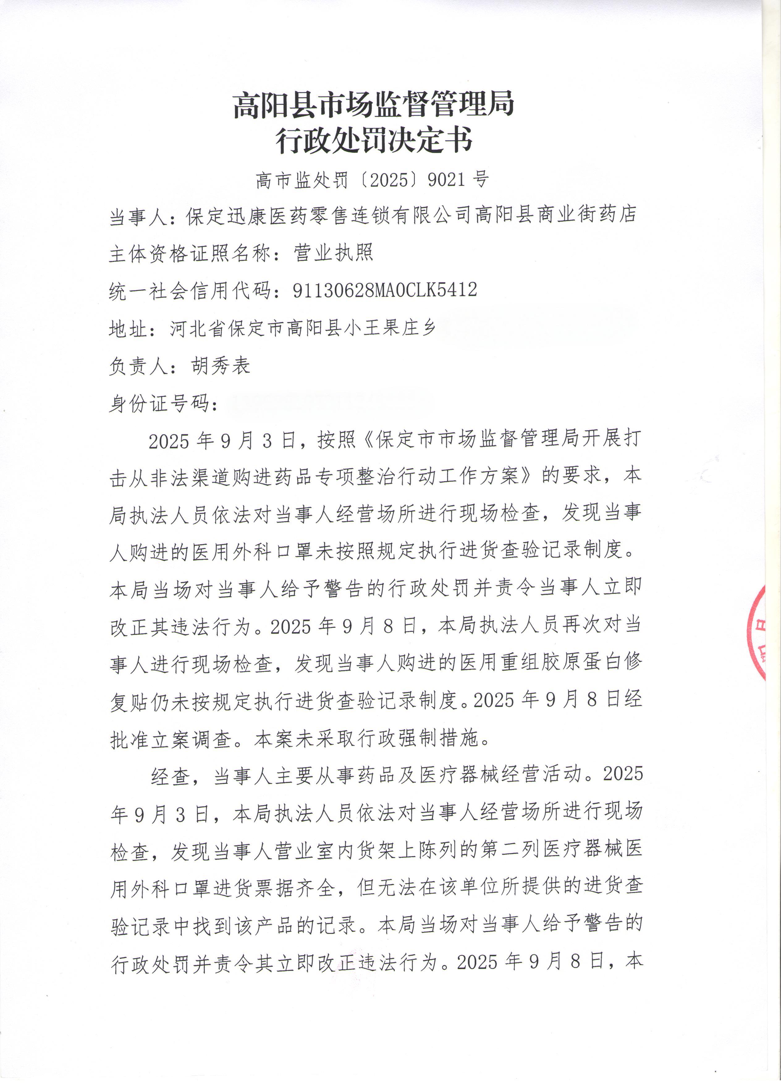 保定迅康医药零售连锁有限公司高阳县商业街药店未按规定执行医疗器械进货查验记录制度案