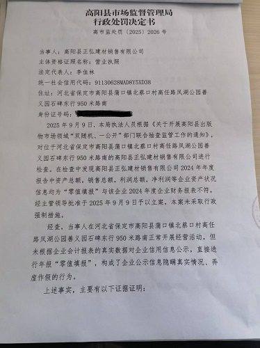 高阳县正弘建材销售有限公司企业公示信息隐瞒真实情况、弄虚作假案