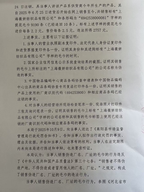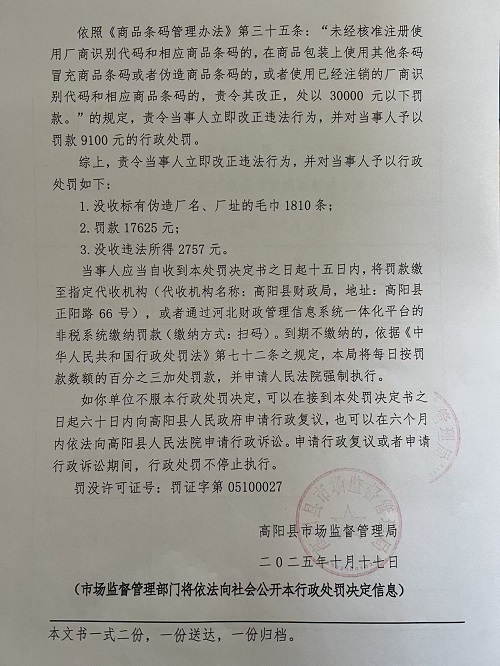 高阳县漫洁纺织品制造有限公司销售伪造厂名、厂址的毛巾和在售的毛巾上擅自使用已经注销的厂商识别代码和相应条码案
