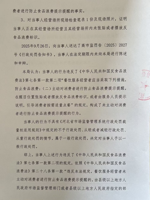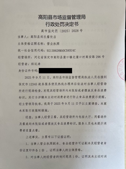 高阳县郑氏餐饮店未主动对消费者进行防止食品浪费提示提醒案