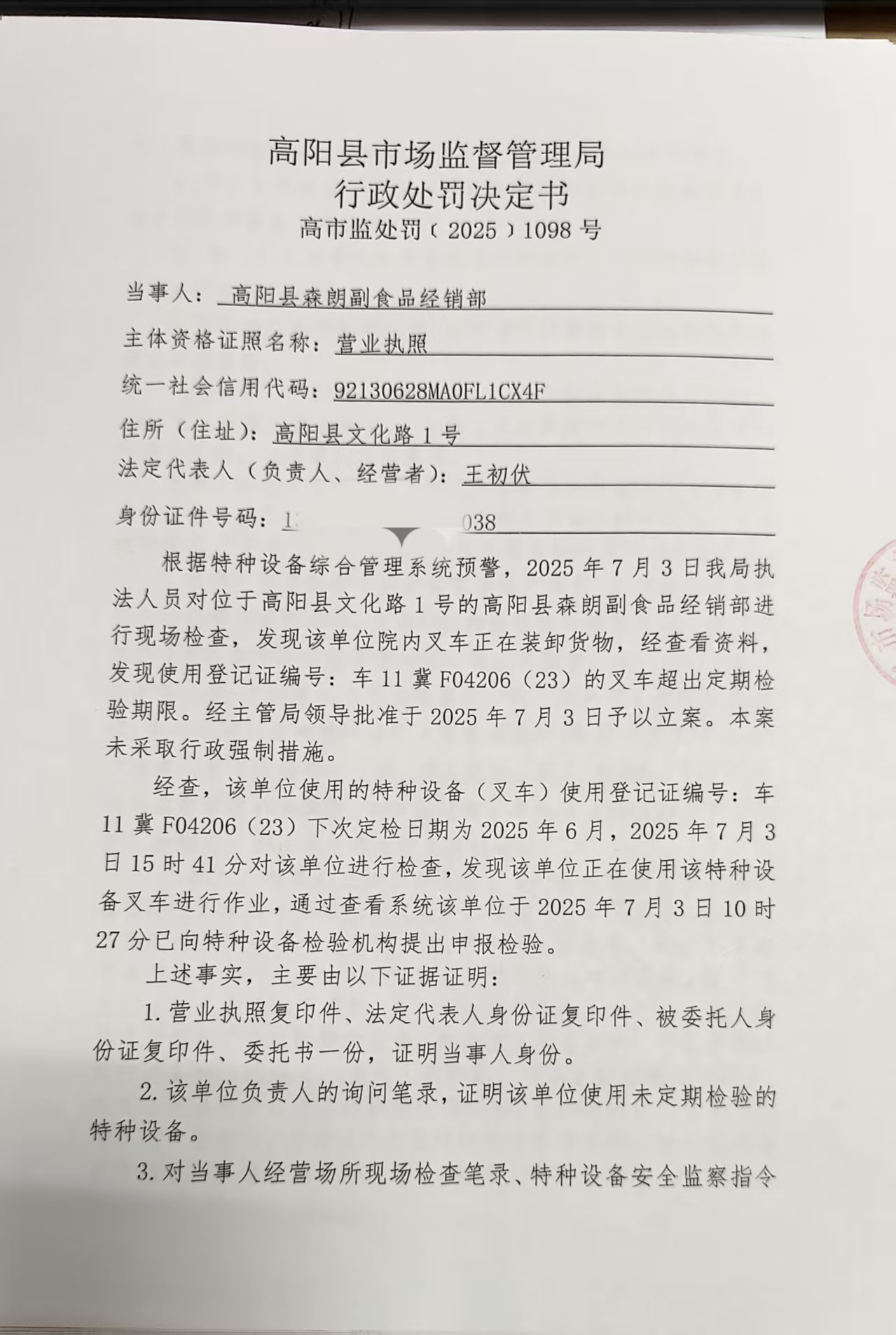 高阳县森朗副食品经销部使用未经定期检验的特种设备案