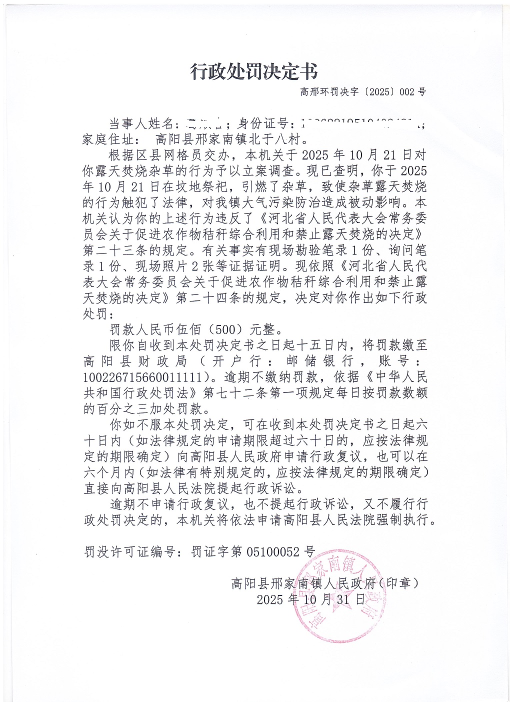高阳县邢家南镇人民政府于2025年10月31日依法向葛顺和送达《行政处罚决定书》高邢环罚决字〔2025〕002号。