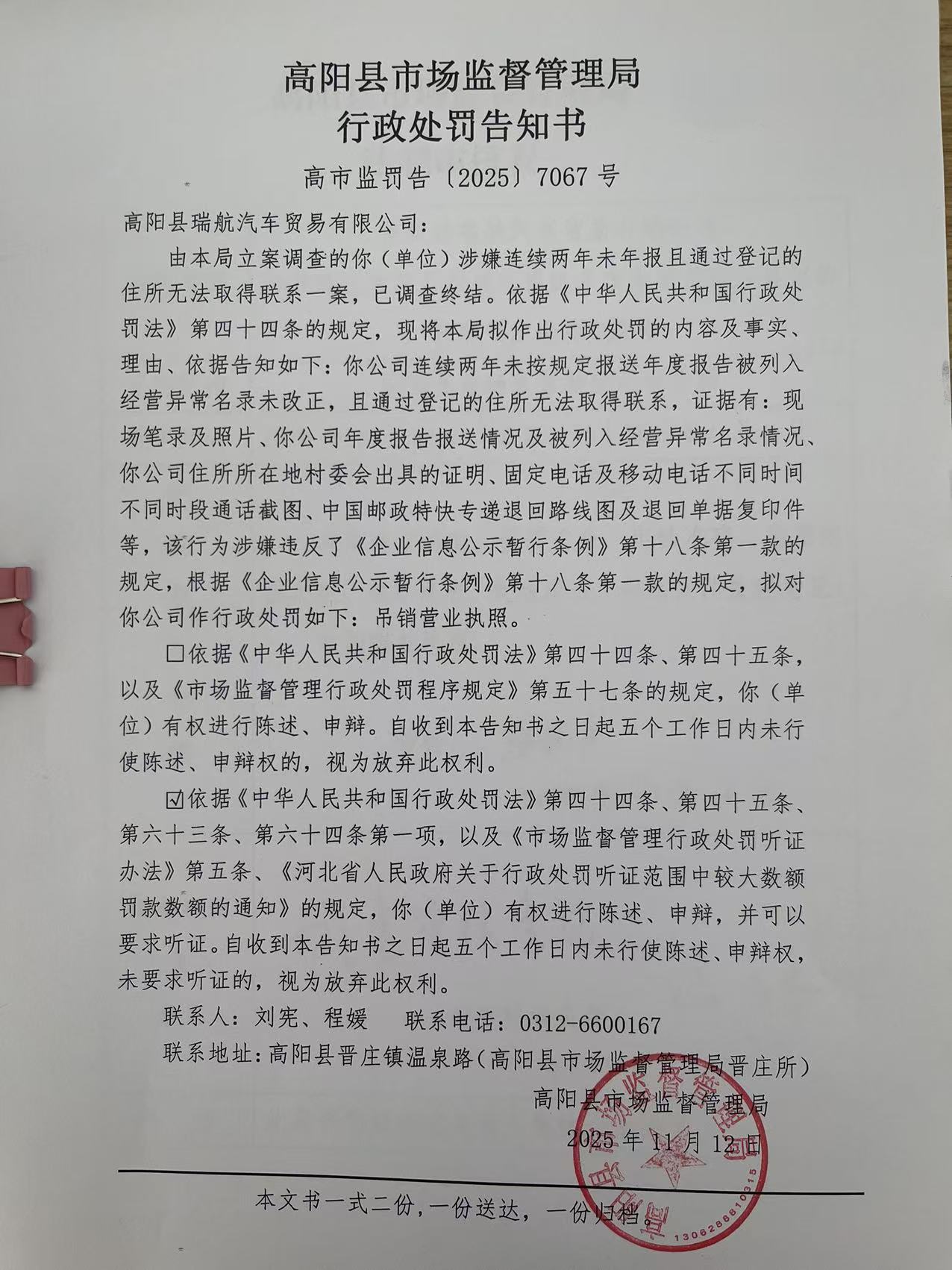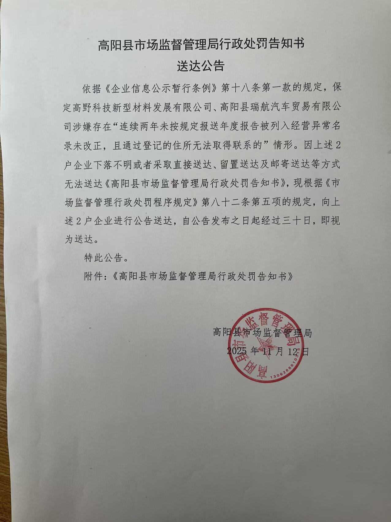 高阳县市场监督管理局行政处罚告知书送达公告