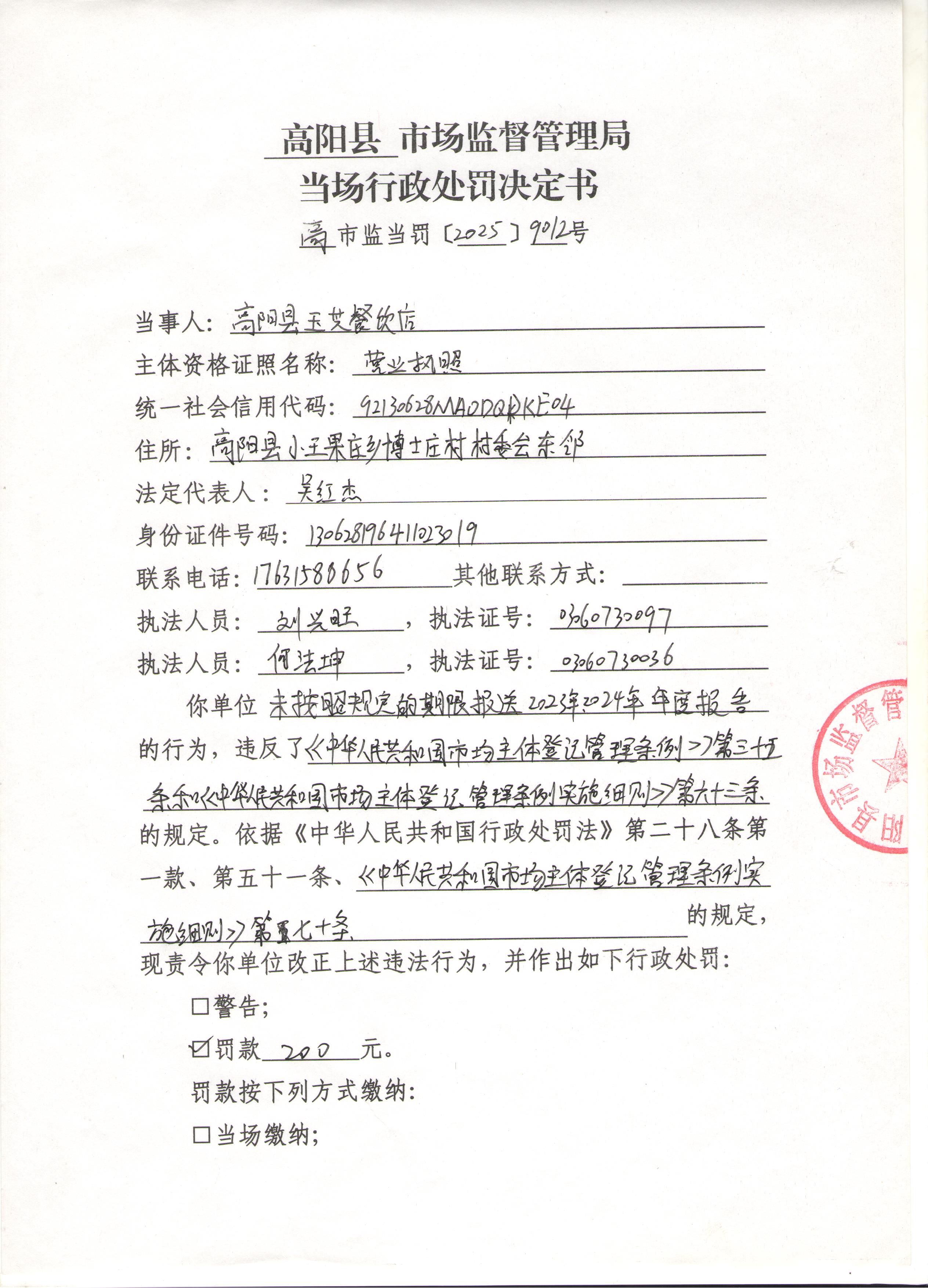 高阳县玉芝餐饮店未按规定期限报送年度报告案