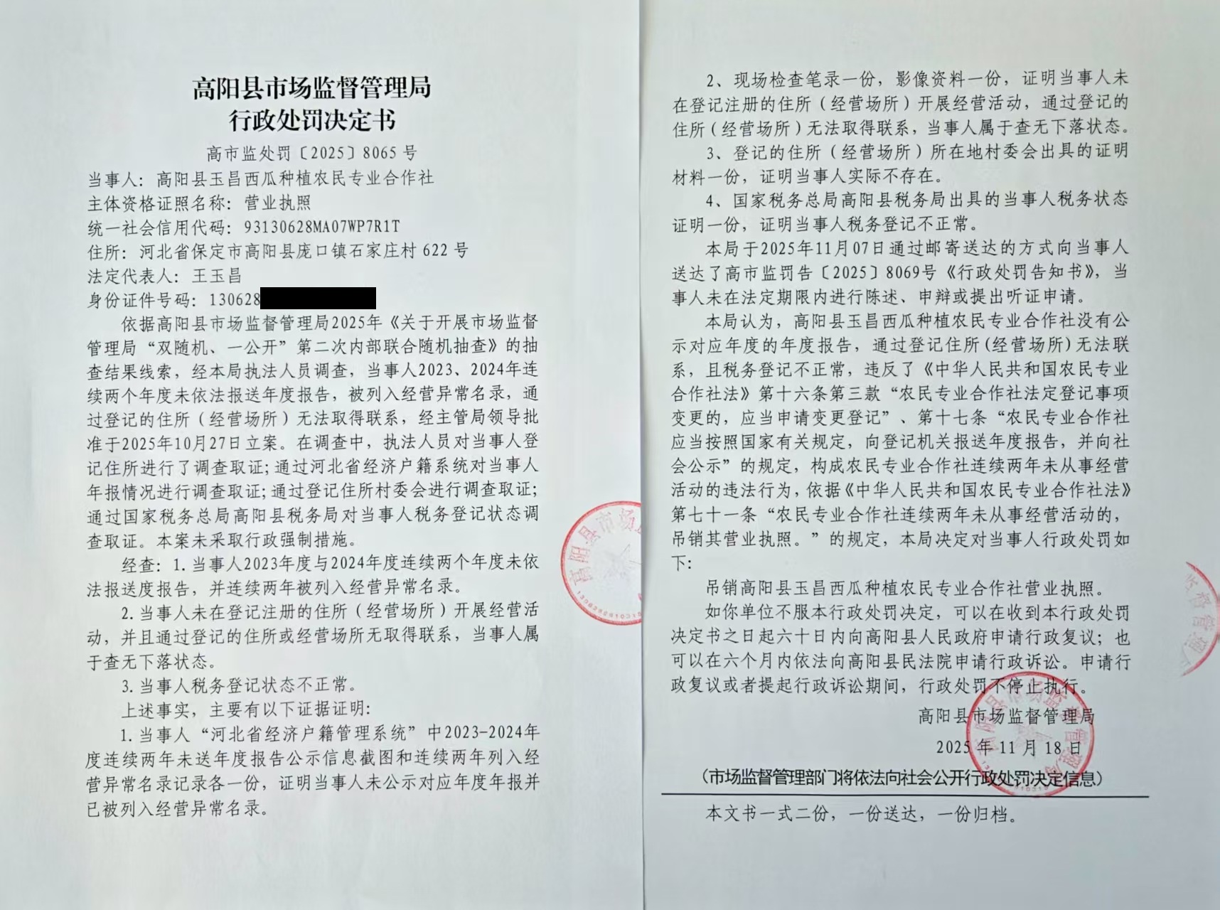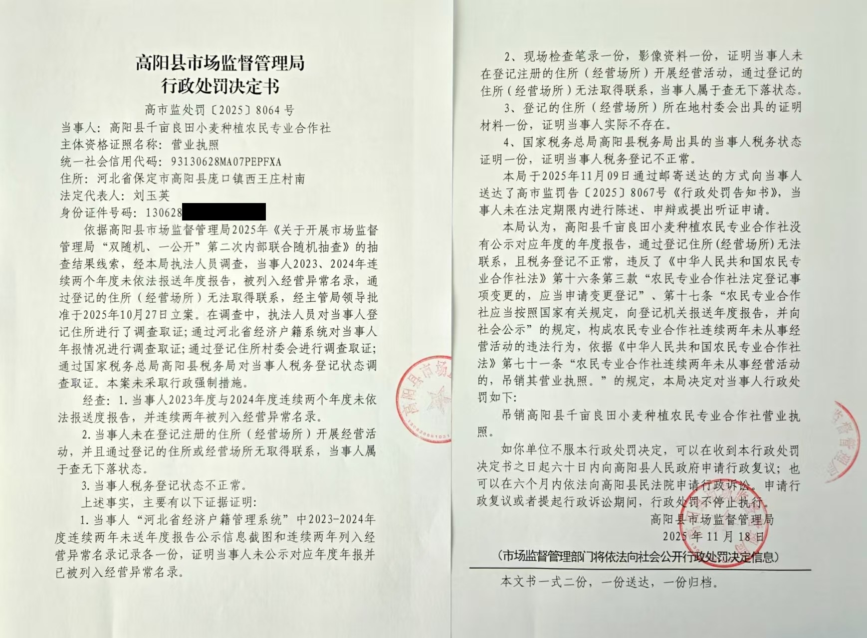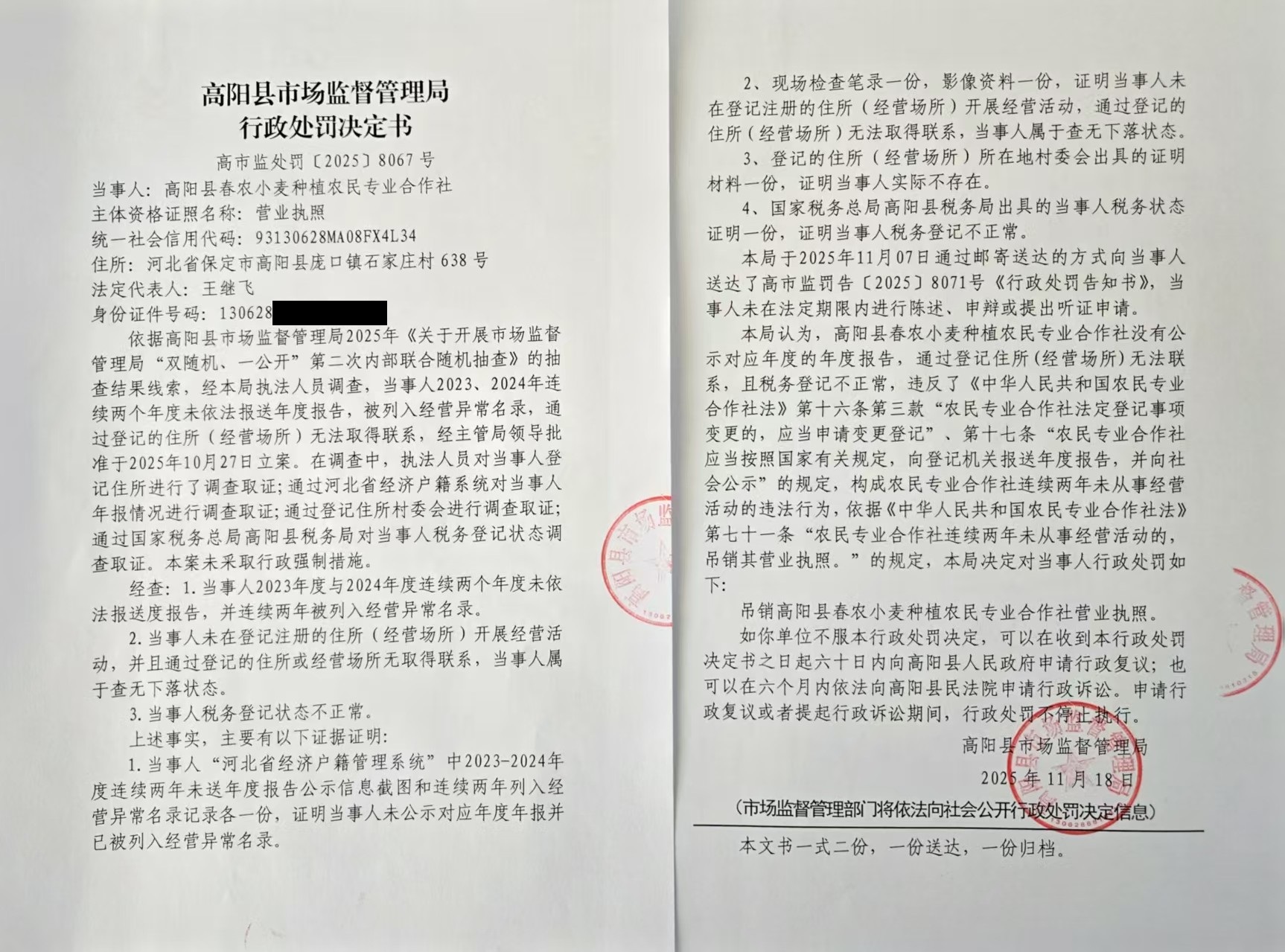 关于吊销高阳县春农小麦种植农民专业合作社等3户农民专业合作社营业执照行政处罚决定的公告