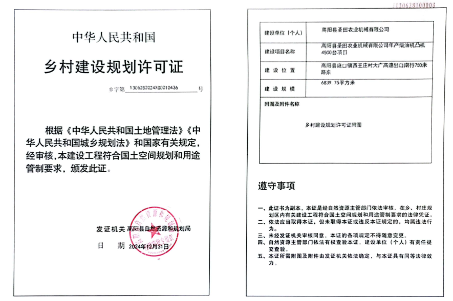 高阳县圣田农业机械有限公司年产柴油机凸机4500台项目乡村建设规划许可证延期至2026年12月31日