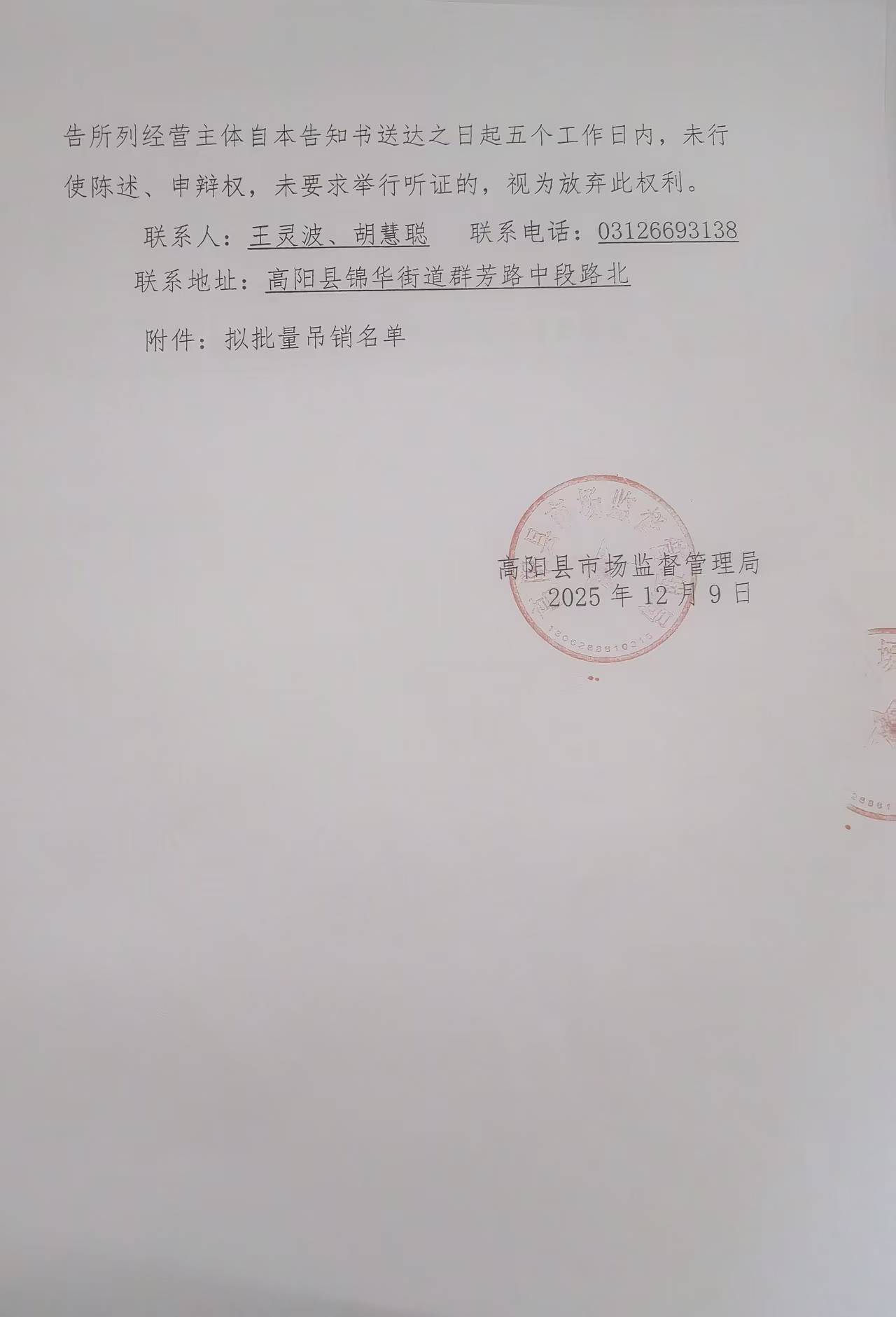 关于拟吊销高阳县占强羊饲养农民专业合作社等2户农民专业合作社营业执照行政处罚告知的公告