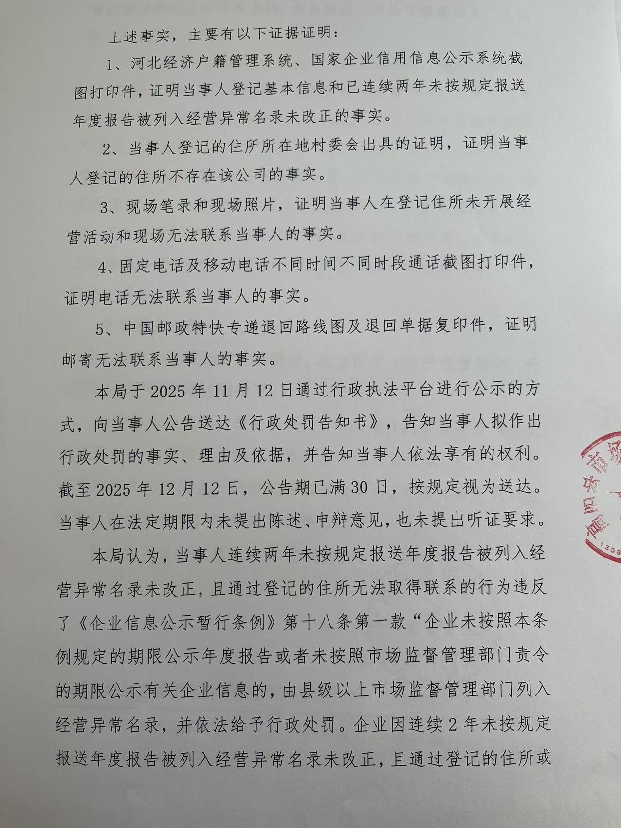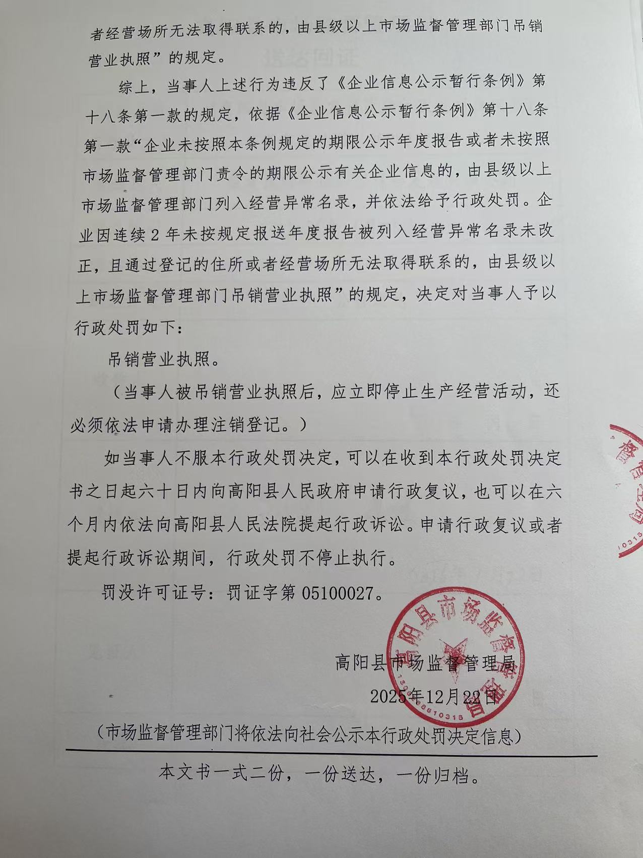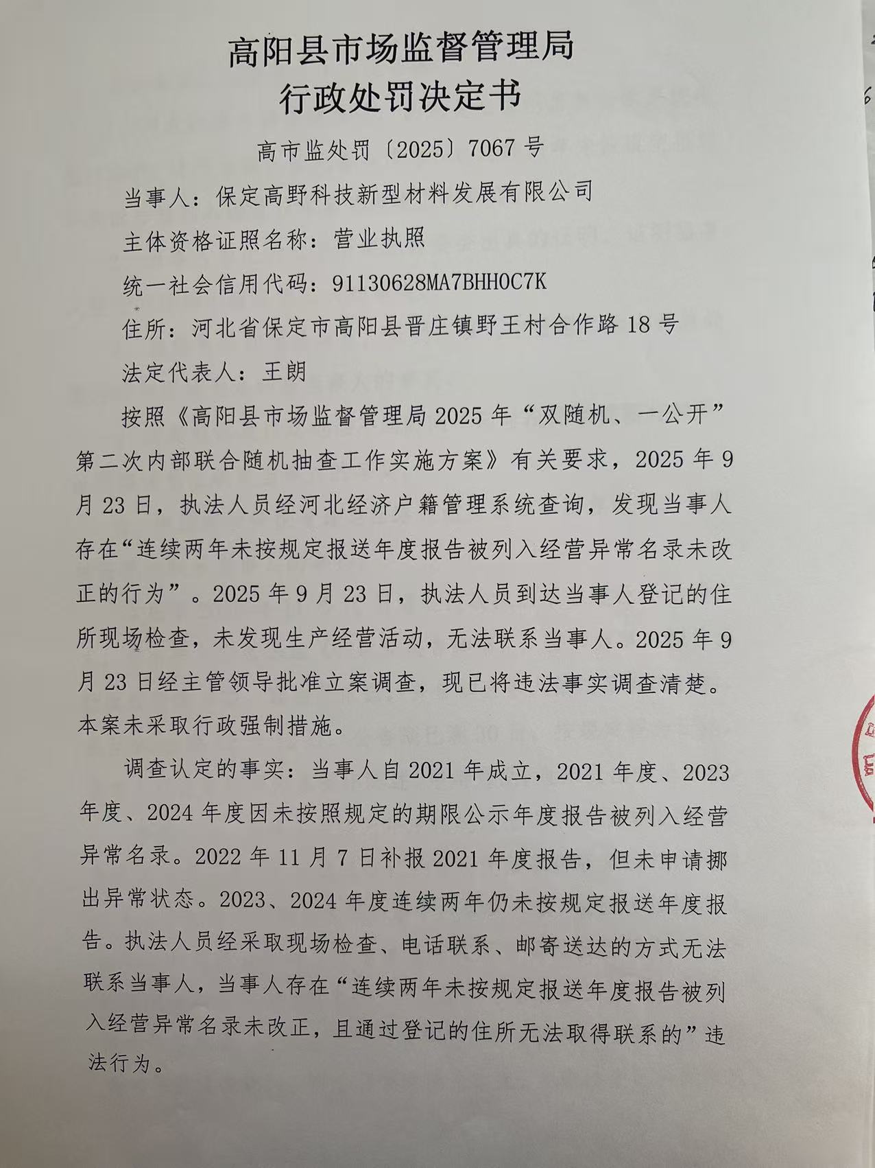 保定高野科技新型材料发展有限公司连续两年未年报且通过登记的住所无法取得联系案