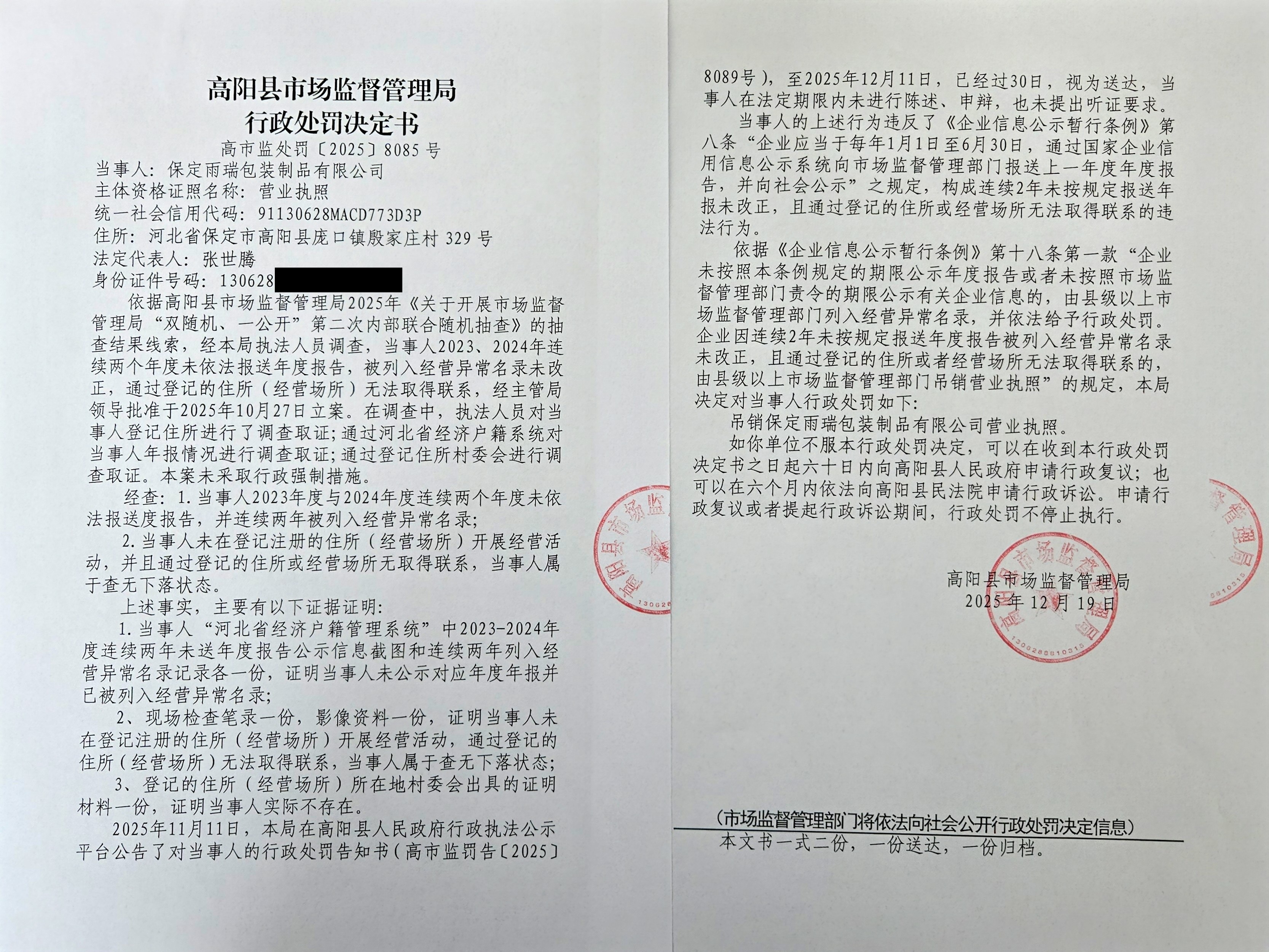保定雨瑞包装制品有限公司连续两个年度未依法报送年度报告且通过登记的住所或经营场所无法取得联系案