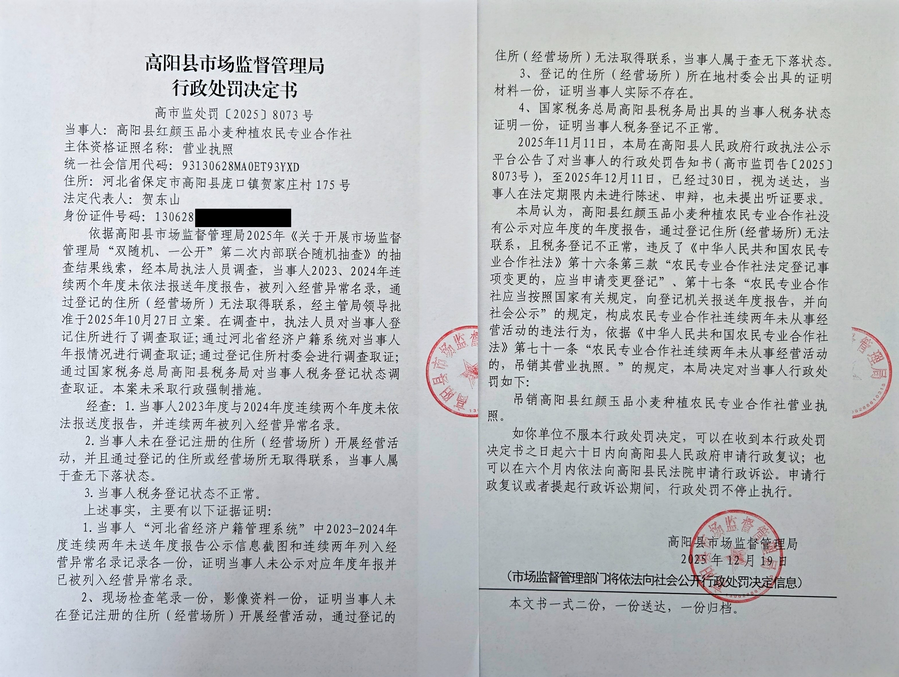 高阳县红颜玉品小麦种植农民专业合作社连续两年未从事经营活动案